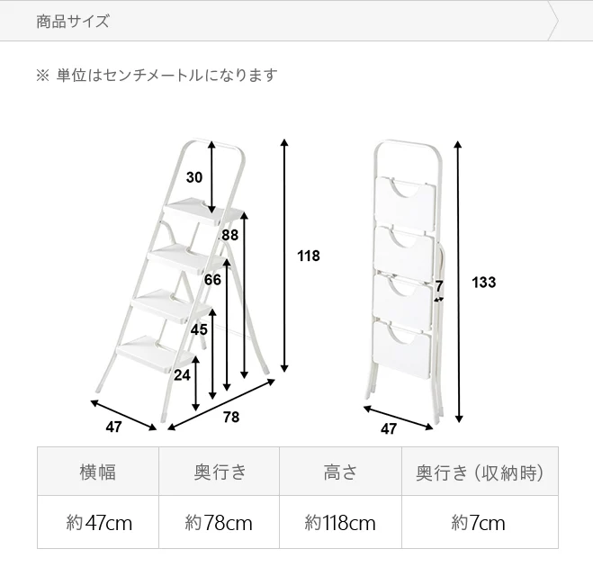 商品サイズ ※単位は「センチメートル」になります 本体サイズ 横幅 奥行き 高さ 約47㎝ 約78㎝ 約118㎝ 各ステップの高さ 1段目 2段目 3段目 4段目 約24㎝ 約45㎝ 約66㎝ 約88㎝ 収納時のサイズ 横幅 奥行き 高さ 約47㎝ 約7㎝ 約133㎝