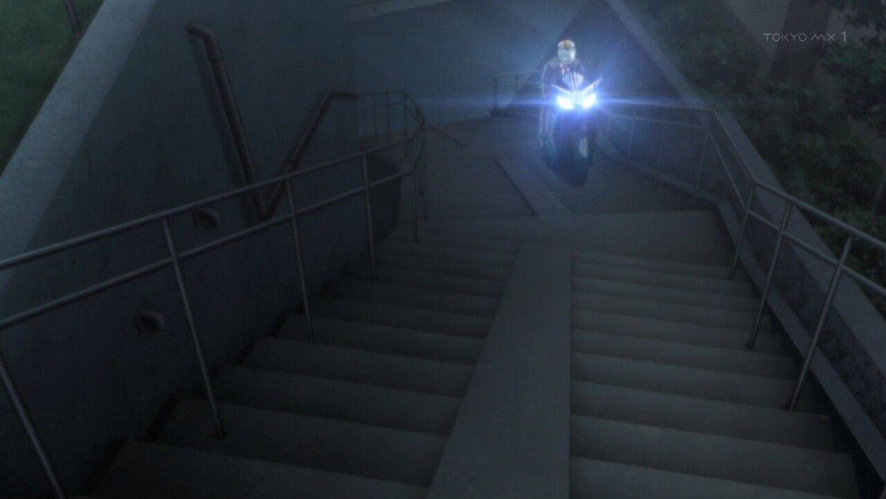 仮面ライダーのバイクって大抵は実際にある車両を使ってます、Wが使用するマシンはハードボイルダーでベースマシンは"ホンダ CBR1000RR”。この手のバイクは階段に細い斜路があれば登れるが可也のテクニックを要します。