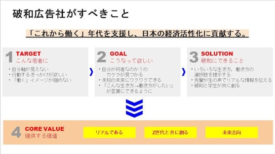 池照 内容としては、破和広告社が若者に対してどうなってほしくて、そのために何をするのかをまとめたスライドだね。