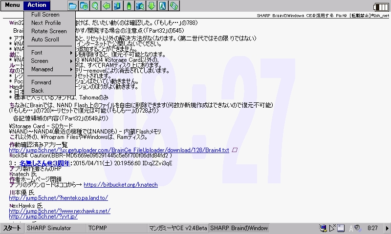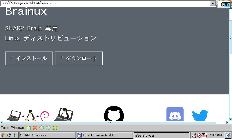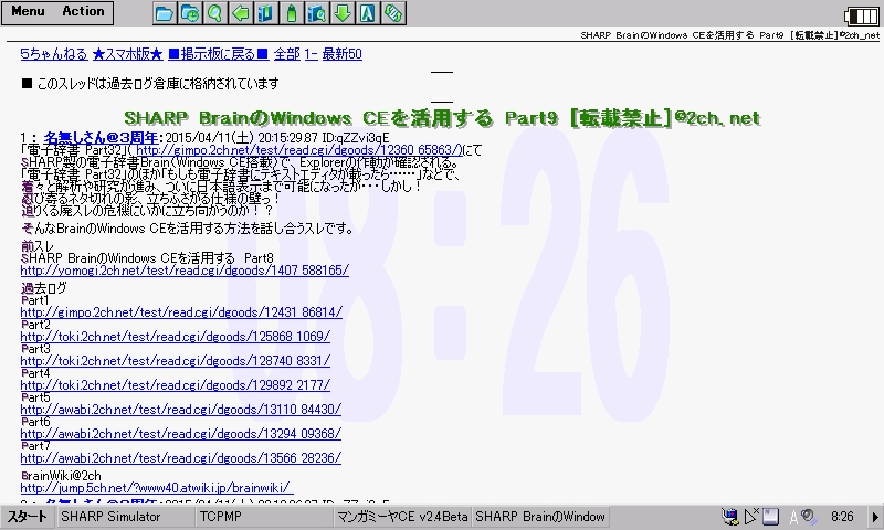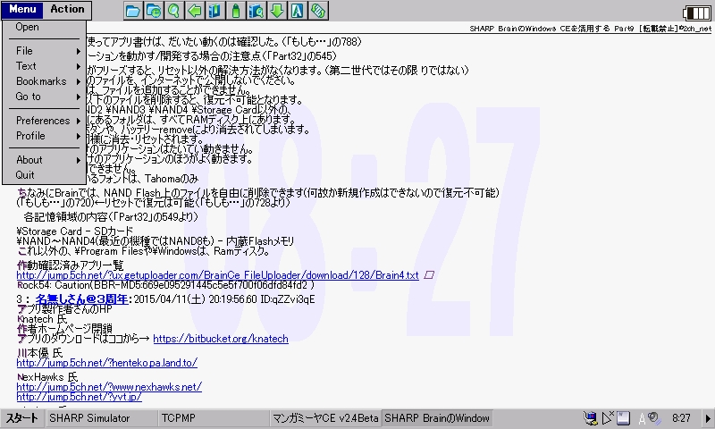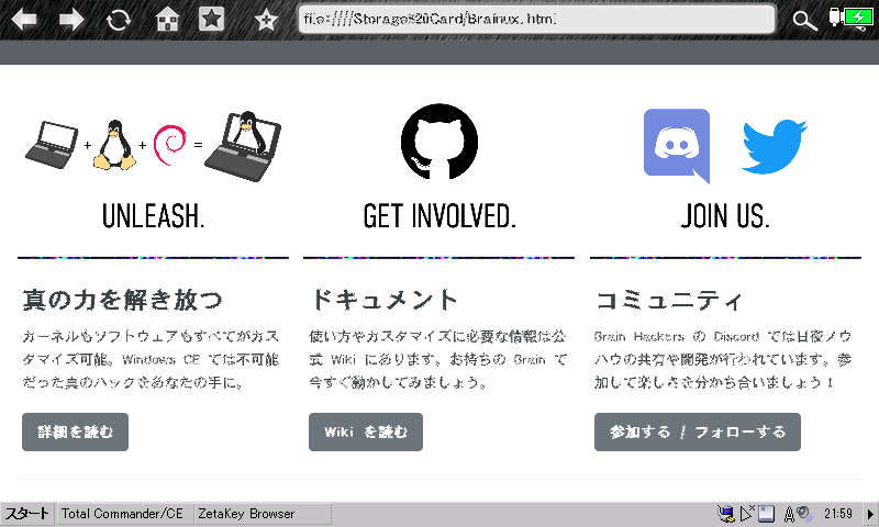 Windows CE 向けブラウザでありながら HTML5/JavaScript に対応する異色のブラウザです。ローカルファイルの読み込みにも対応し、AlReader2 よりはるかに高い再現度で Web サイトを閲覧できますが、Brain で動かすにはひと手間加える必要があります。