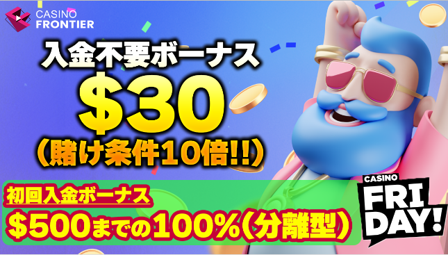 カジノフロンティアからの新規登録限定で賭け条件10倍の30ドルを獲得可能です。