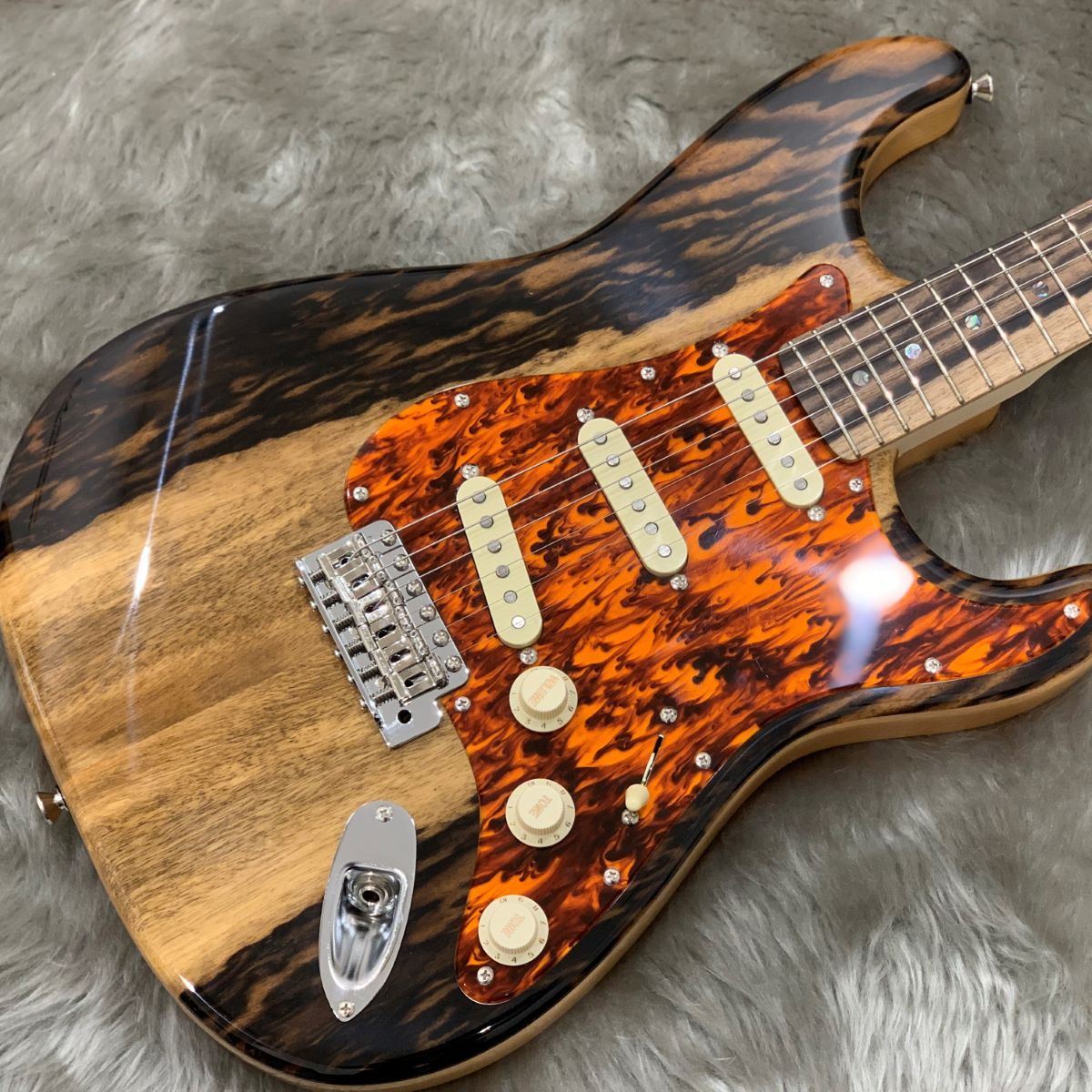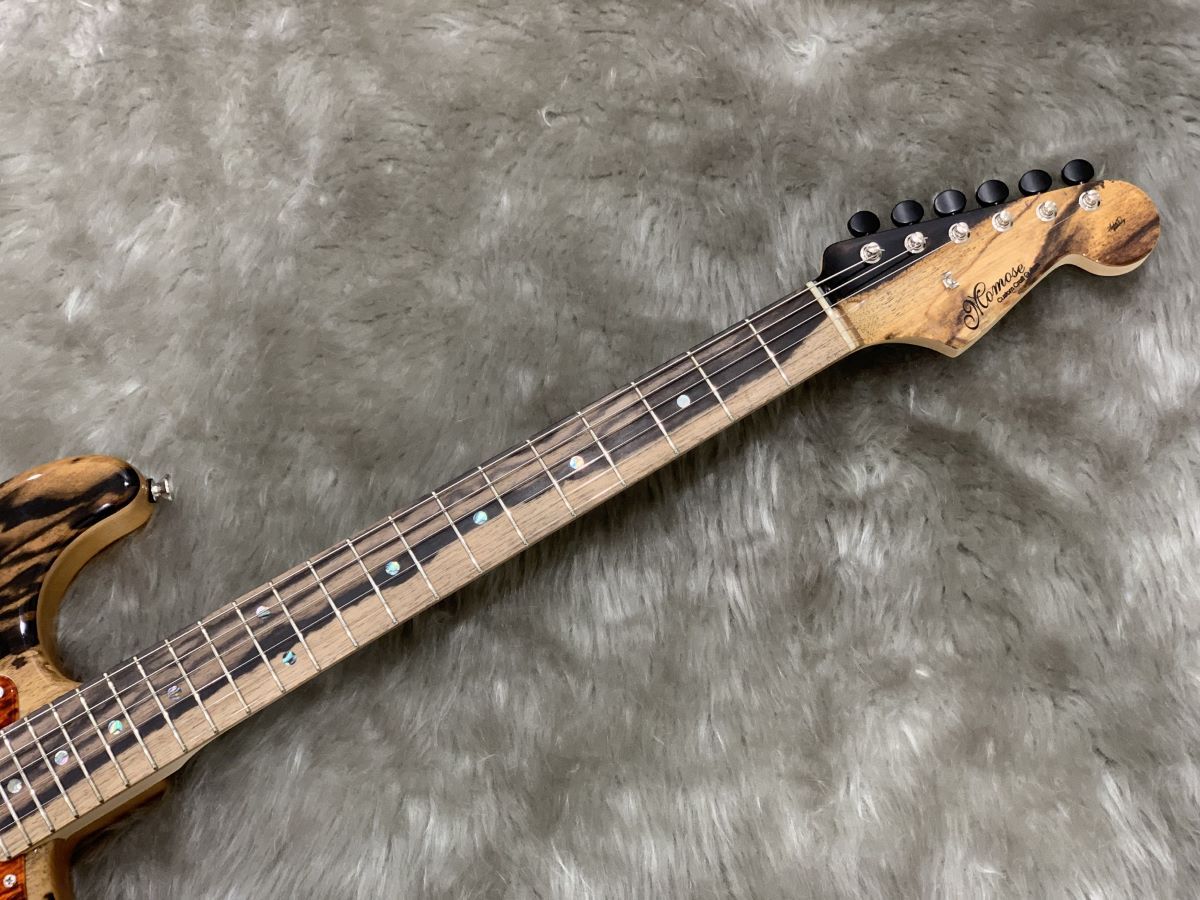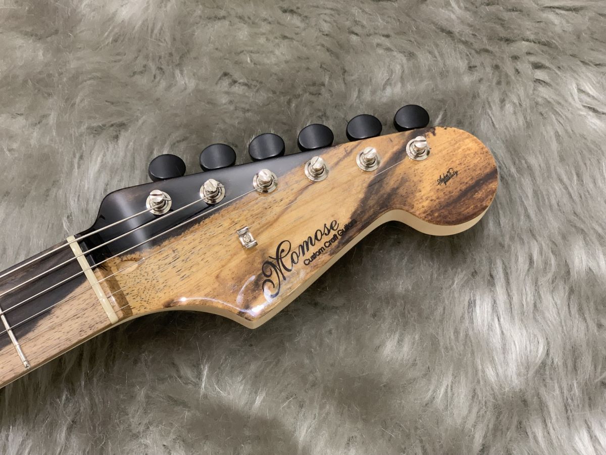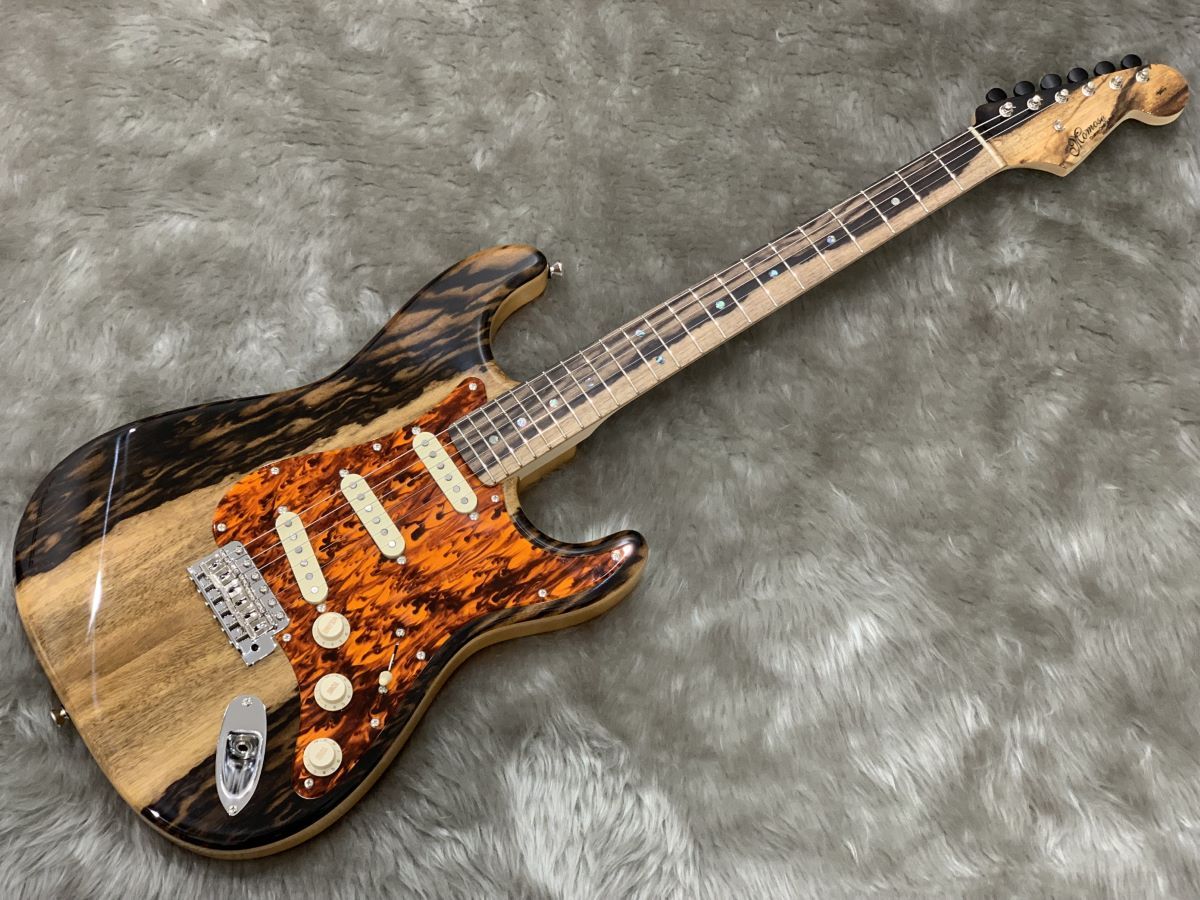 柿の古木は数万本に1本現れるとされ、その希少性と美しさから、あらゆる工芸品の中でも最高級に使用される【黒柿】をTOP板、指板、ヘッドストックに使用されております。MC1和-Kurogaki-をモデルにオーダーされた一品です。