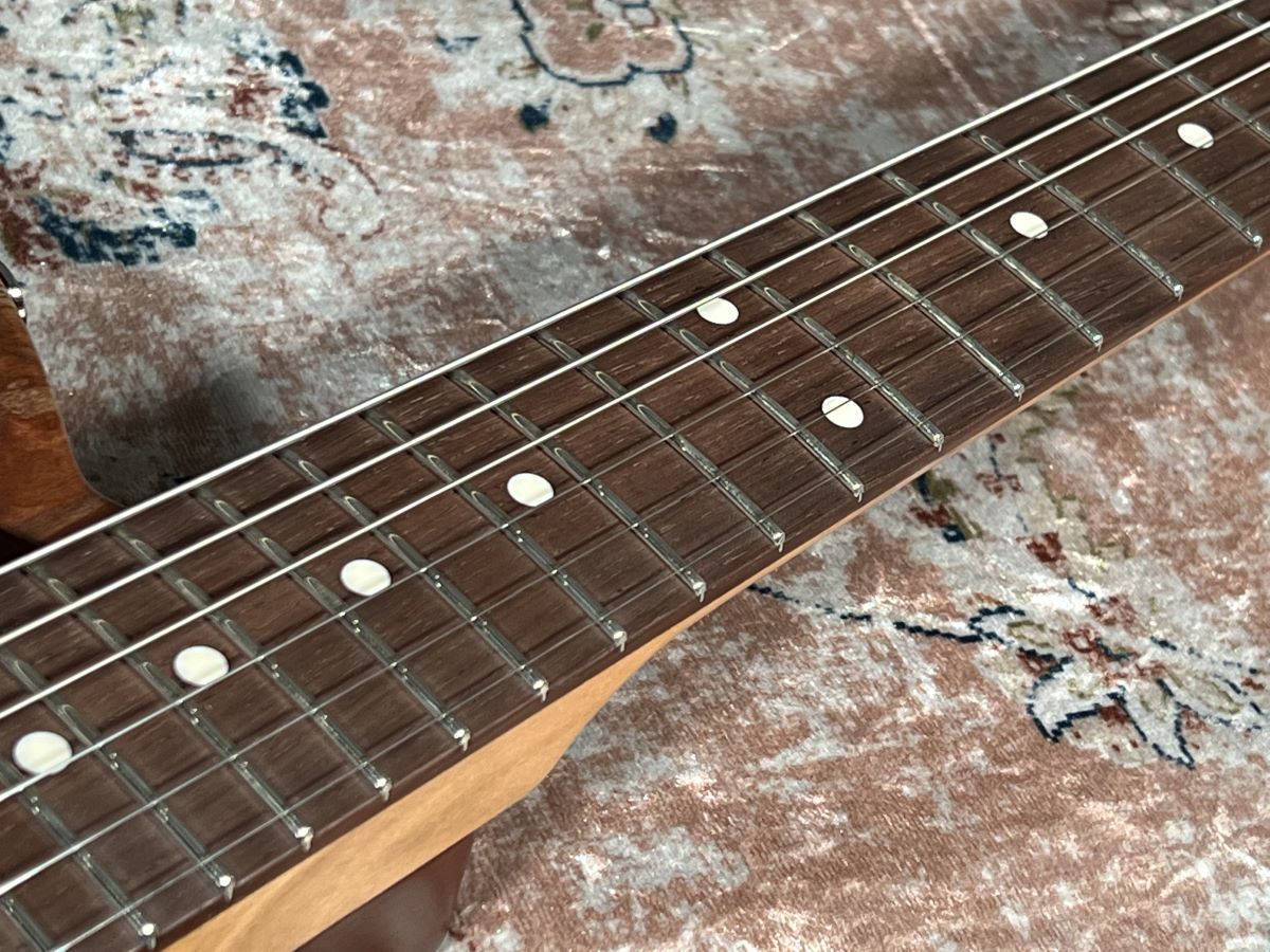 今回はアッセンブリーにも拘り、マスターボリュームを引き上げると各PUが直列になるシリーズパラレルスイッチを搭載。マスタートーンは引き上げるとローカットになり、ハイもローもどちらをカットするか選べる使用になっています。