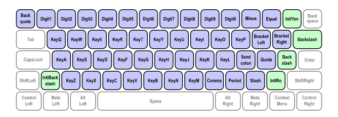 物理キーを取得する。 ・5を押した場合、フルキーボードの5(Digit5)とNumPadの5(NumPad5)は区別される ・上位のキーマップの影響は受けない。 ・IEは対象外 Key Codes for Standard Keyboards