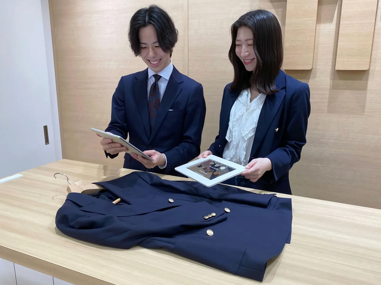 現在は店舗でコーディネーターとして働き、採寸やお客さまに合った生地、アイテムのご提案をしています。また、現在は店舗のストアマネージャー候補を任せていただいているため、店舗運営やメンバーのマネジメントも行っています。
