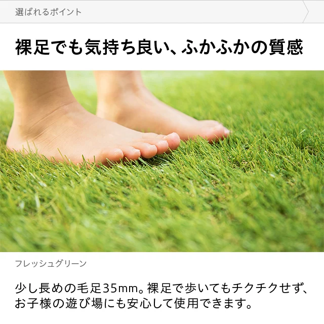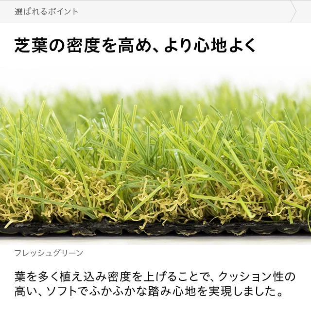 芝葉の密度を高め、より心地よく葉を多く植え込むことで、クッション性の高い、ソフトでふかふかな踏み心地を実現しました。 当社プロトタイプ 当商品 約23.4万本/1㎡葉もボリュームも少ない 約41万本/1㎡密度が高くてふかふか 密度はプロトタイプの約1.7倍!