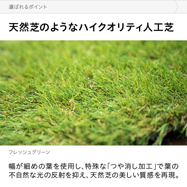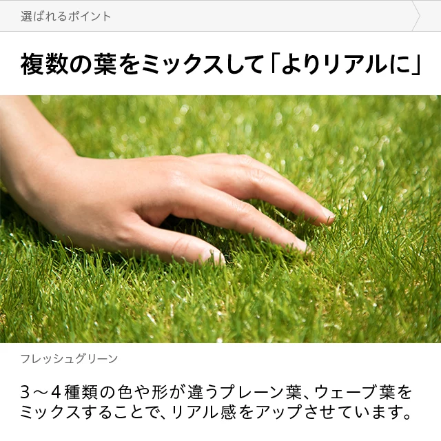 天然芝のようなハイクオリティ人工芝特殊な「つや消し加工」で葉の不自然な光の反射を抑え、天然芝の美しい質感を再現。また、幅が細めの葉を使い、リアルで触り心地の良い芝生に仕上げました。当社プロトタイプ当商品見た目△◎触り心地△◎葉の種類1種類4種類葉の幅太目細目