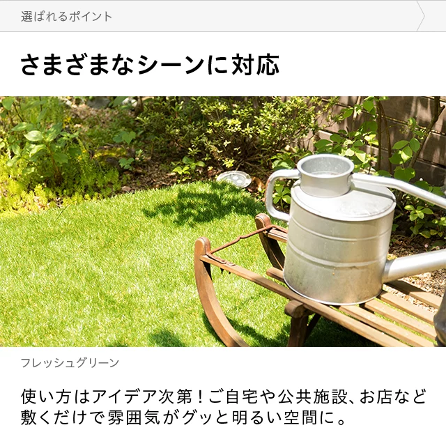 さまざまなシーンに対応使い方はアイデア次第!ご自宅や公共施設、お店など敷くだけで雰囲気がグッと明るい空間に。温かみのあるお庭に殺風景で冷たい印象だったベランダが、温かみのある緑のガーデンに。外に出るのが楽しみになります。<前へ次へ>