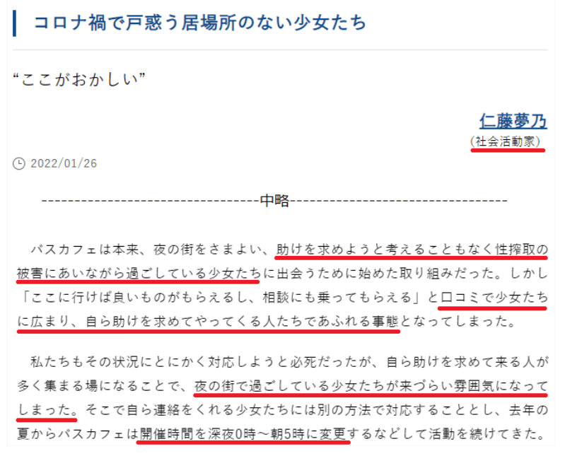 次はこれ。Colaboが支援対象をえり好みしているかのように書いていますが、当初の目的が達成しにくくなったため活動時間を変えた程度のことしか読み取れませんし、それもやはり団体の方針の範疇です。もちろん、ひとつの団体があらゆる困窮者を支援することは不可能ですから、文句があるならセーフティーネットを用意できない都に言うべきです。にもかかわらず、限界はありつつも支援を続けているColaboへのいちゃもんが優先されてしまうあたり、やはり彼らは未成年の困窮者などどうでもいいでしょう。
