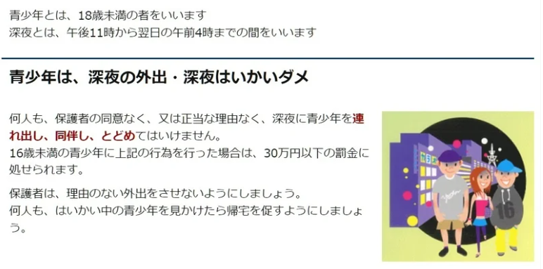 彼が引用したかった条例は、正式には『東京都青少年の健全な育成に関する条例』といい、夜間外出に関する条文は以下の通りです。