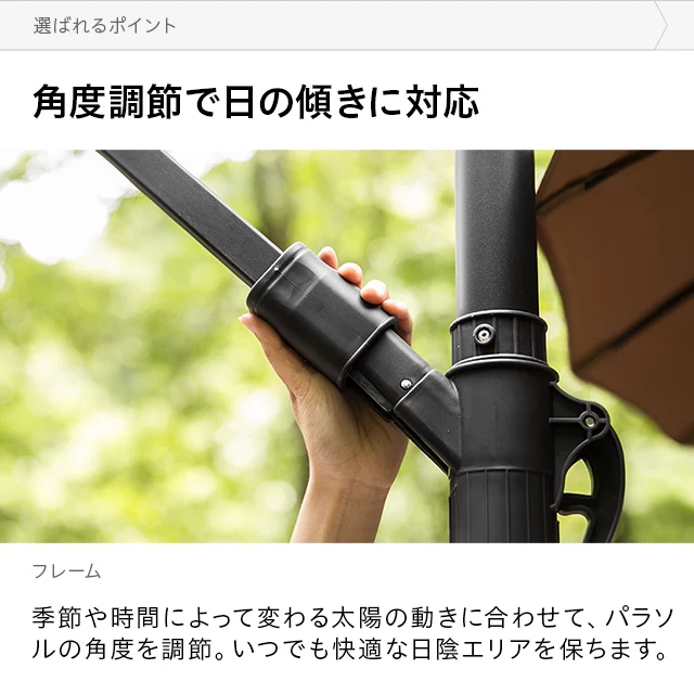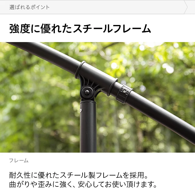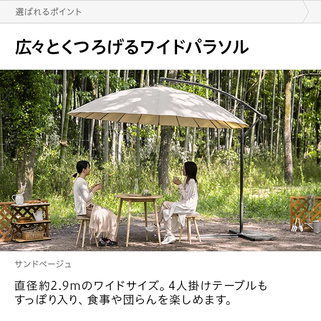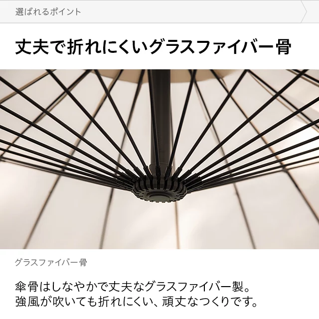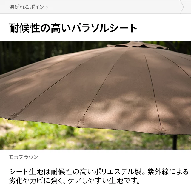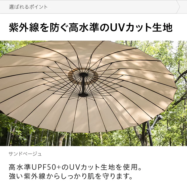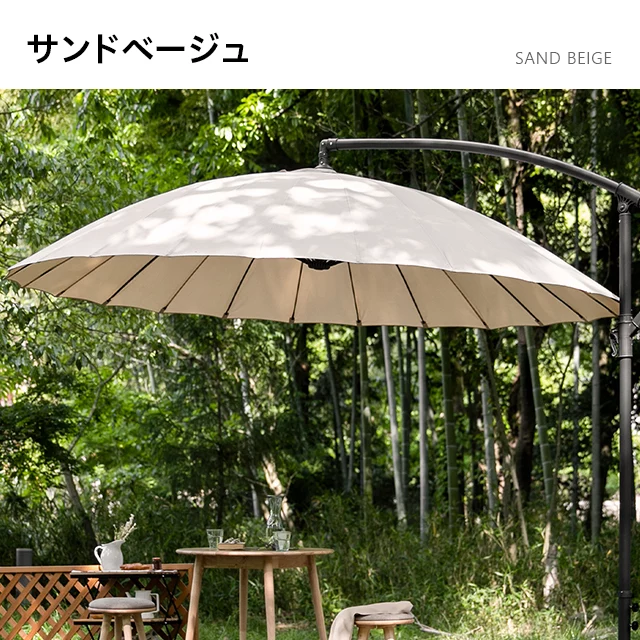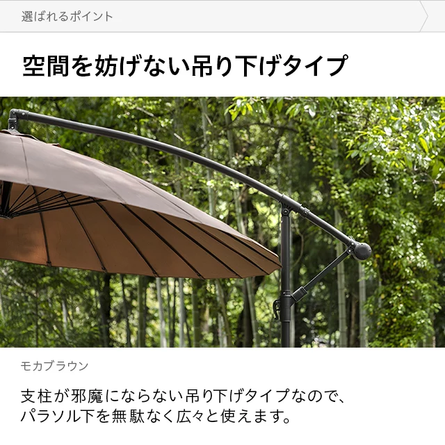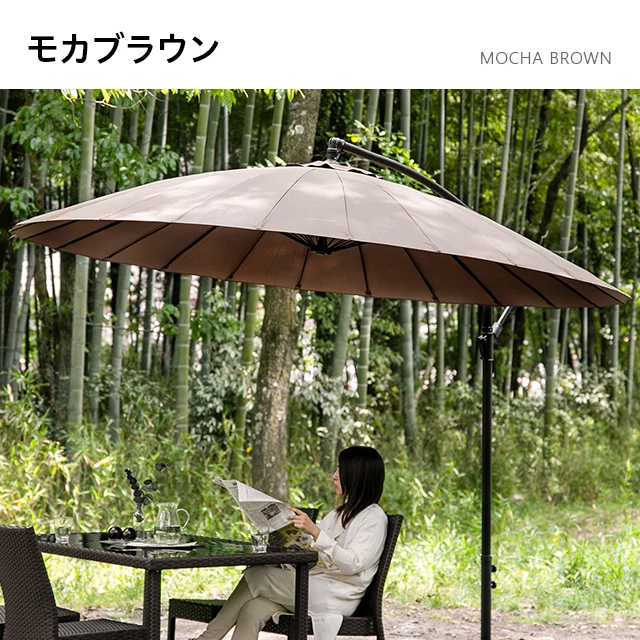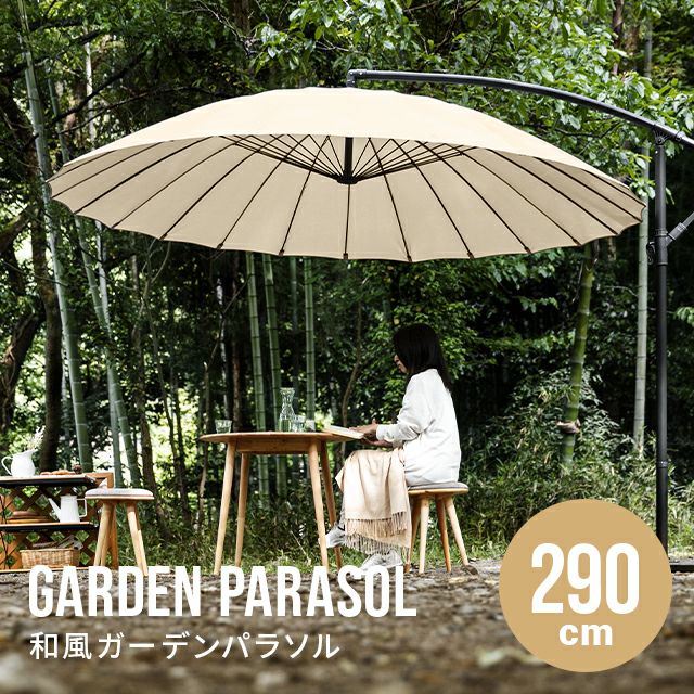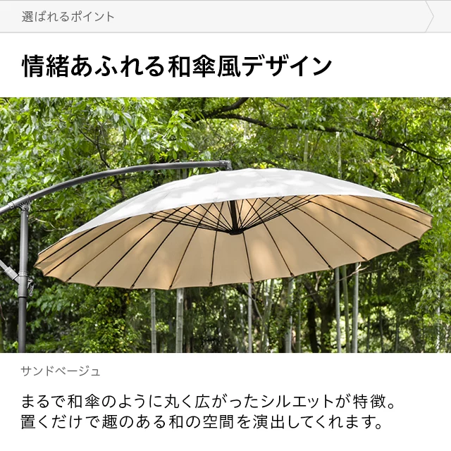和テイストでゆったり寛ぐガーデンパラソル 和の空間にも自然に溶け込む和風パラソル。支柱が邪魔にならない吊り下げタイプなので、複数人でくつろいでも広々快適。日差しをしっかりカットしながら、落ち着きのあるリラックス空間を演出します。