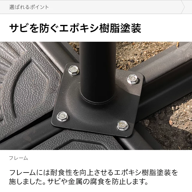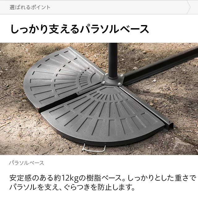 しっかり支えるパラソルベース 安定感のある約12㎏の樹脂ベース。しっかりとした重さでパラソルを支え、ぐらつきを防止します。 ベース重量約12㎏ 樹脂ベースが1個付属してますこちらのページでご購入いただきますと、樹脂ベースが1個付属いたします。