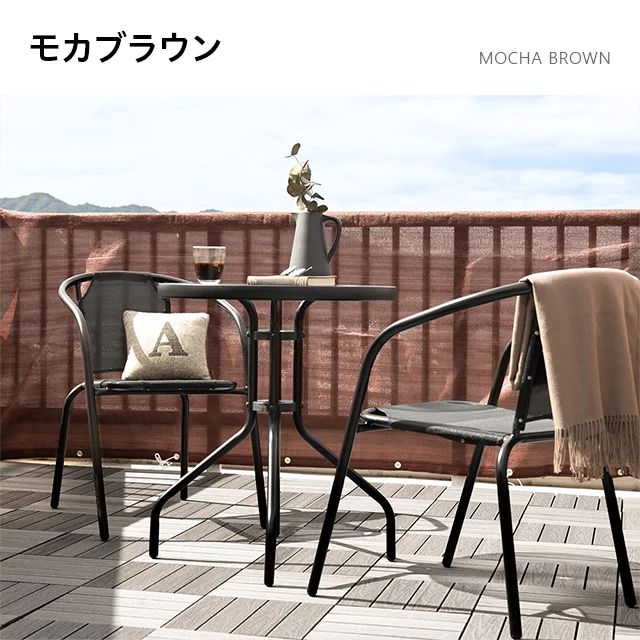 こちらは100×180㎝サイズのページです おうち時間を快適にするバルコニーシェード 優れた通気性でありながら透けにくいシェード生地で、周りの目を気にせずおうち時間を楽しめるバルコニーシェード。紫外線から肌を守るUVカットと涼し気な日陰を作る遮光性で、バルコニーを快適な癒し空間に。
