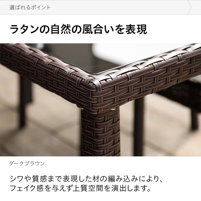 お庭にリゾートガーデンの趣きを。 ナチュラルでありながら上質なリゾートホテルに佇むような気品。ラタン調テーブルの存在は、あえて外で食事したくなるような高揚感すら与えてくれます。 ご自宅のガーデンで南国気分を味ったり、オープンカフェのようなリラックスタイムに浸ったり…。 ぜひ、ご自分だけの癒しの空間をお楽しみください。 <前へ次へ>