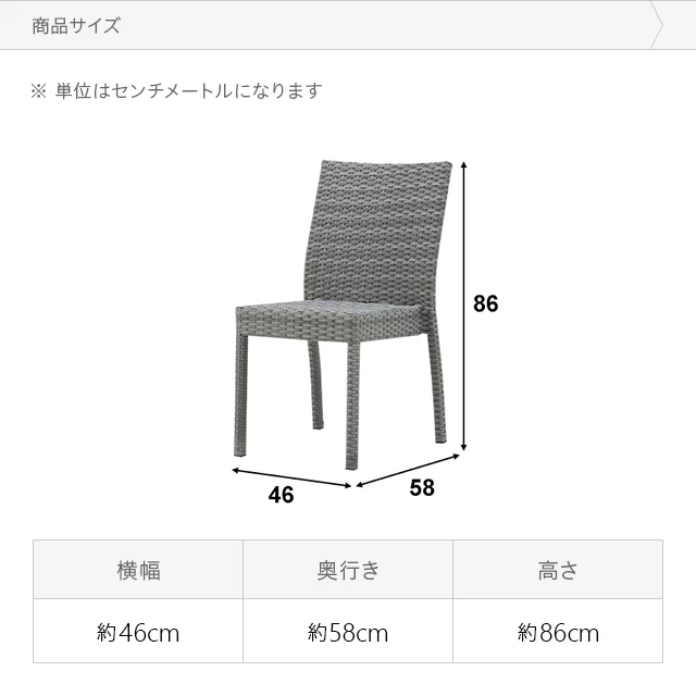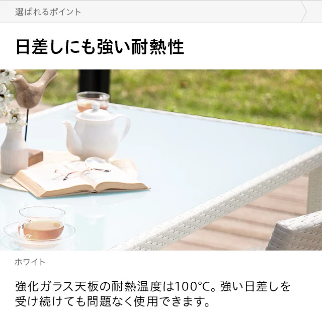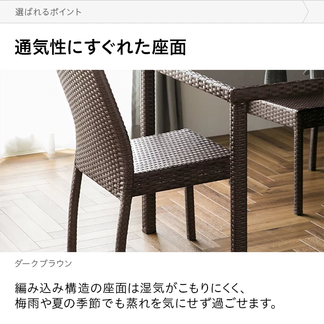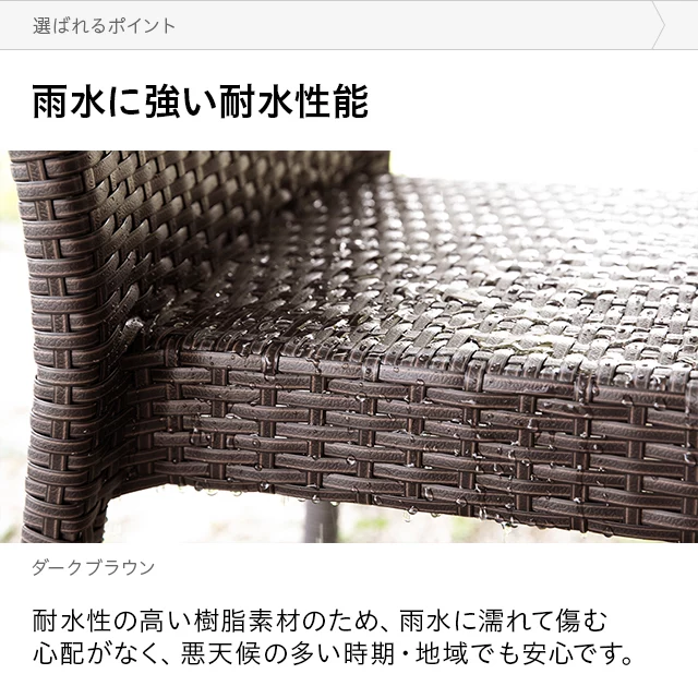 雨水に強い耐水性能 耐水性の高い樹脂素材のため、雨水に濡れて傷む心配がなく、悪天候の多い時期・地域でも安心です。 メンテナンスも簡単 雨に濡れても拭くだけでOK。埃などの汚れもサッと水拭きすることができます。