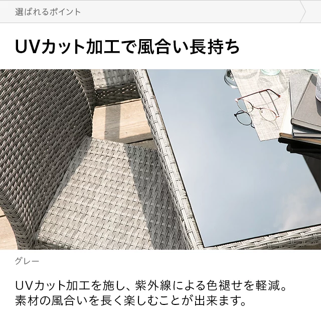 UVカット加工で風合い長持ち UVカット加工を施し、紫外線による色褪せを軽減。素材の風合いを長く楽しむことが出来ます。 1000時間のUV耐久性試験を実施 専用の機械で1000時間のUV耐久性試験を行いました。日光による退色が少ない、高品質な人工ラタンです。