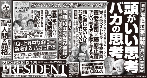 11月25日(金)発売「プレジデント」(2022年12/16号)の特集「頭がいい思考、バカの思考」では、本稿のほか、「頭がいい人は、なぜ頭がいいのか」をテーマに取り上げています。「東大卒ベストセラー作家・特別対談◎養老孟司×藤原正彦」「話が通じない人は、なぜ通じないのか」「東大卒医師・和田秀樹が警鐘!頭の調子が悪くなる“スマホ”のカラクリ」に加えて、「最新脳科学が解明した記憶力・集中力アップ法」「AIにできない思考法」「賢い人だけがやっている知的習慣」など、一生使える最新情報を満載しています。