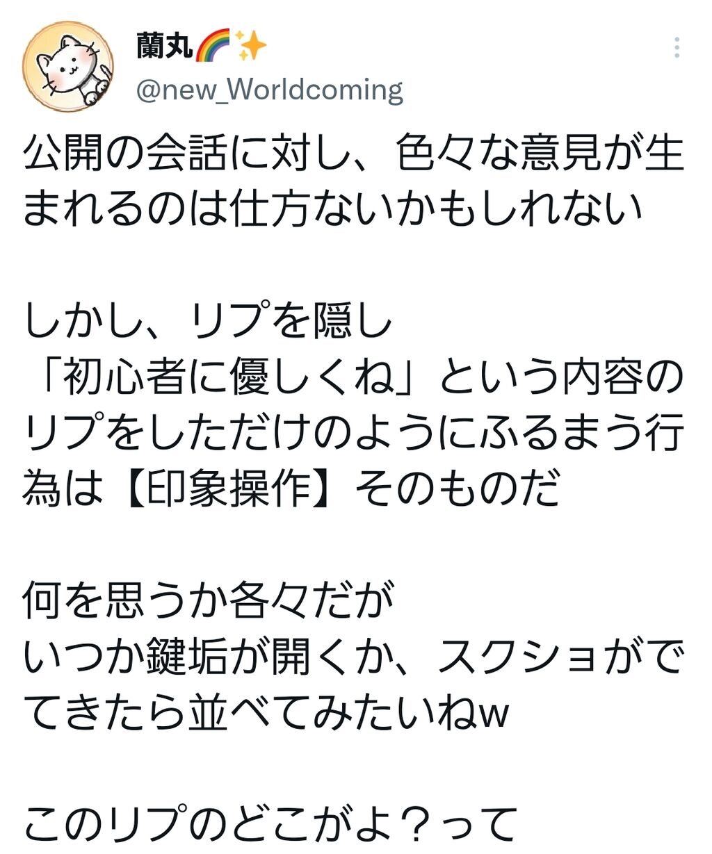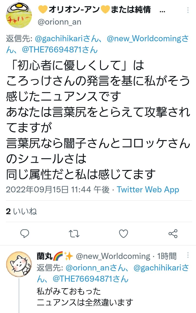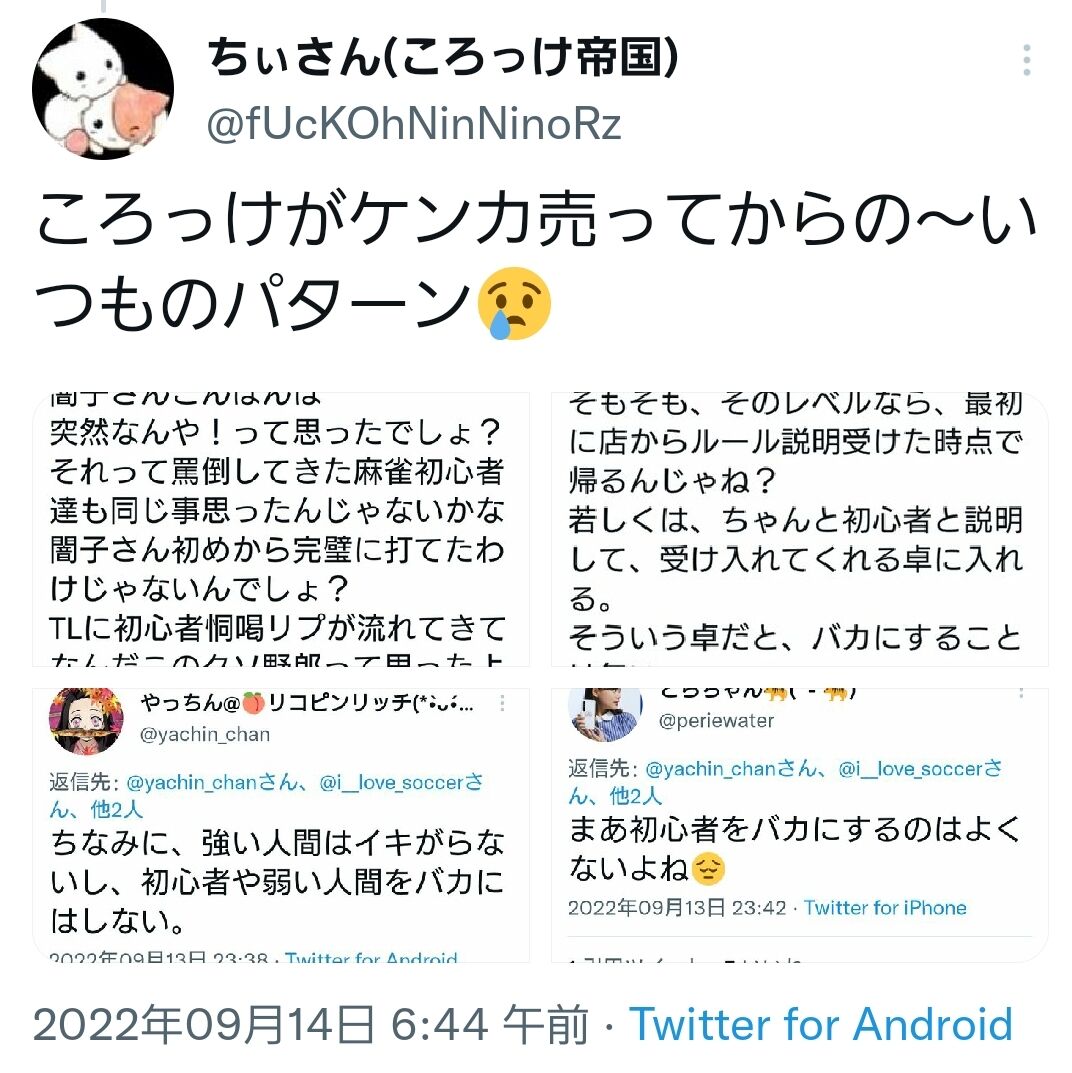 うん、確かに判断が変ですね。だってコロッケは「初心者に優しくしてね」なんて一言も書いてなかったと思いますよ。彼はいきなり別垢で突っかかってきてこんな感じでした。