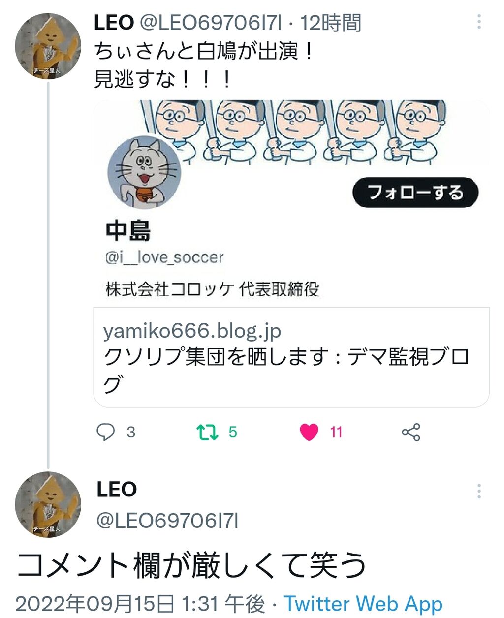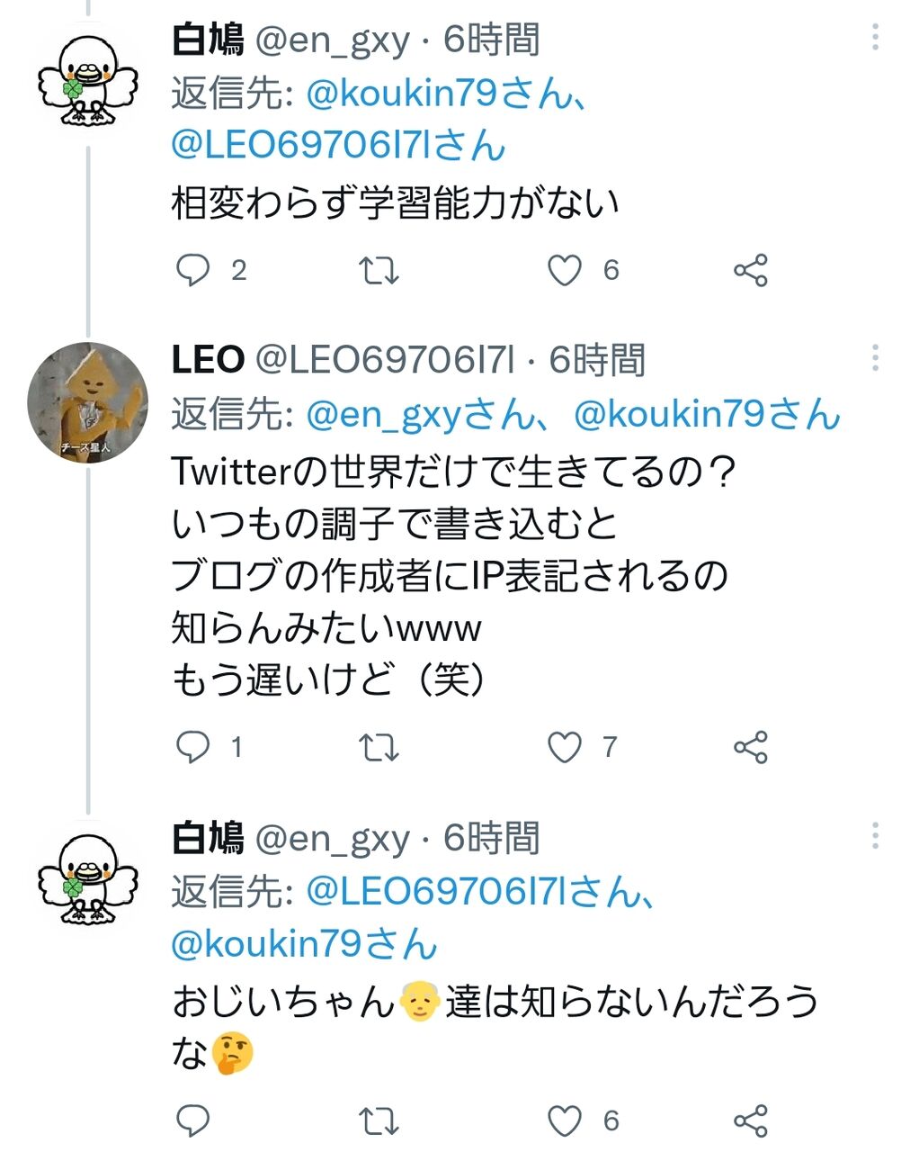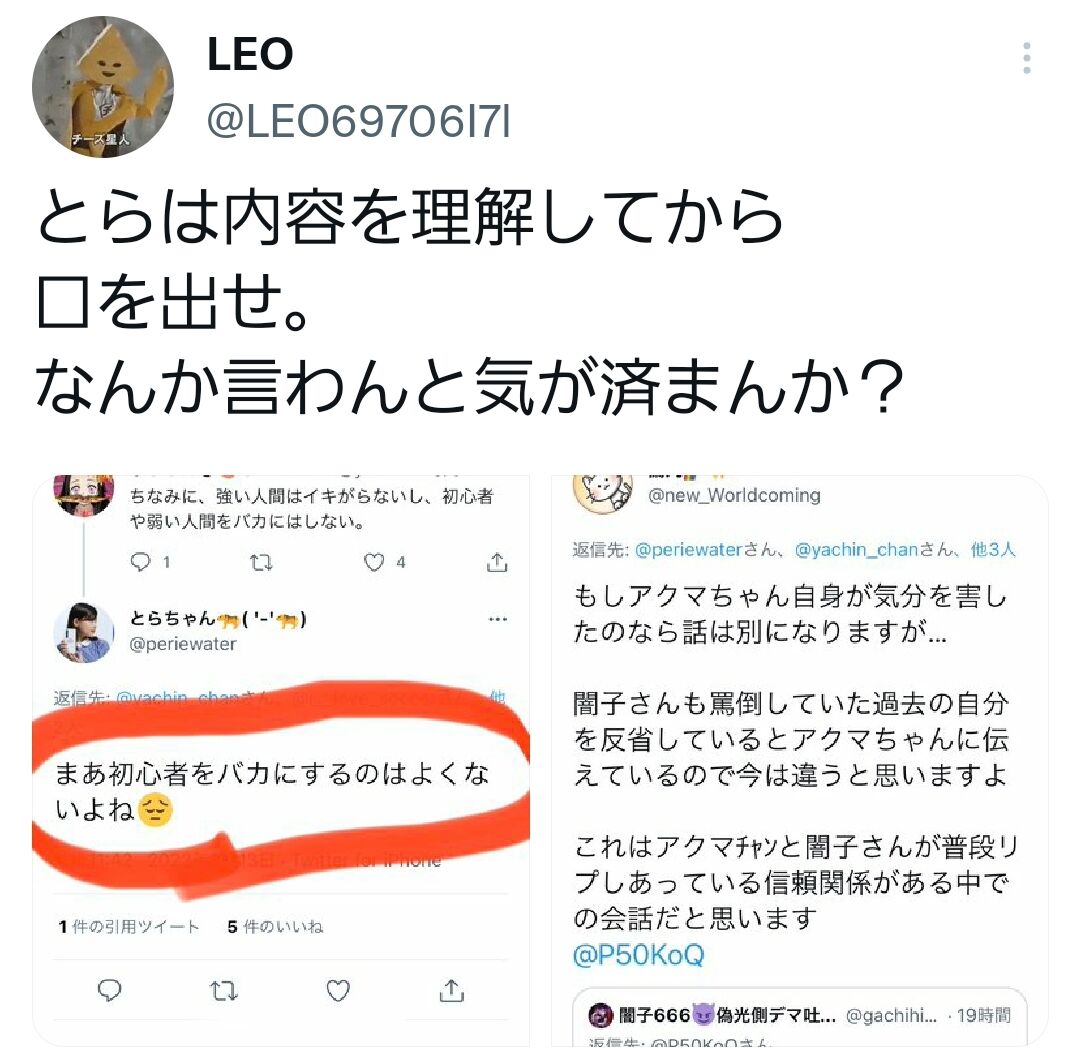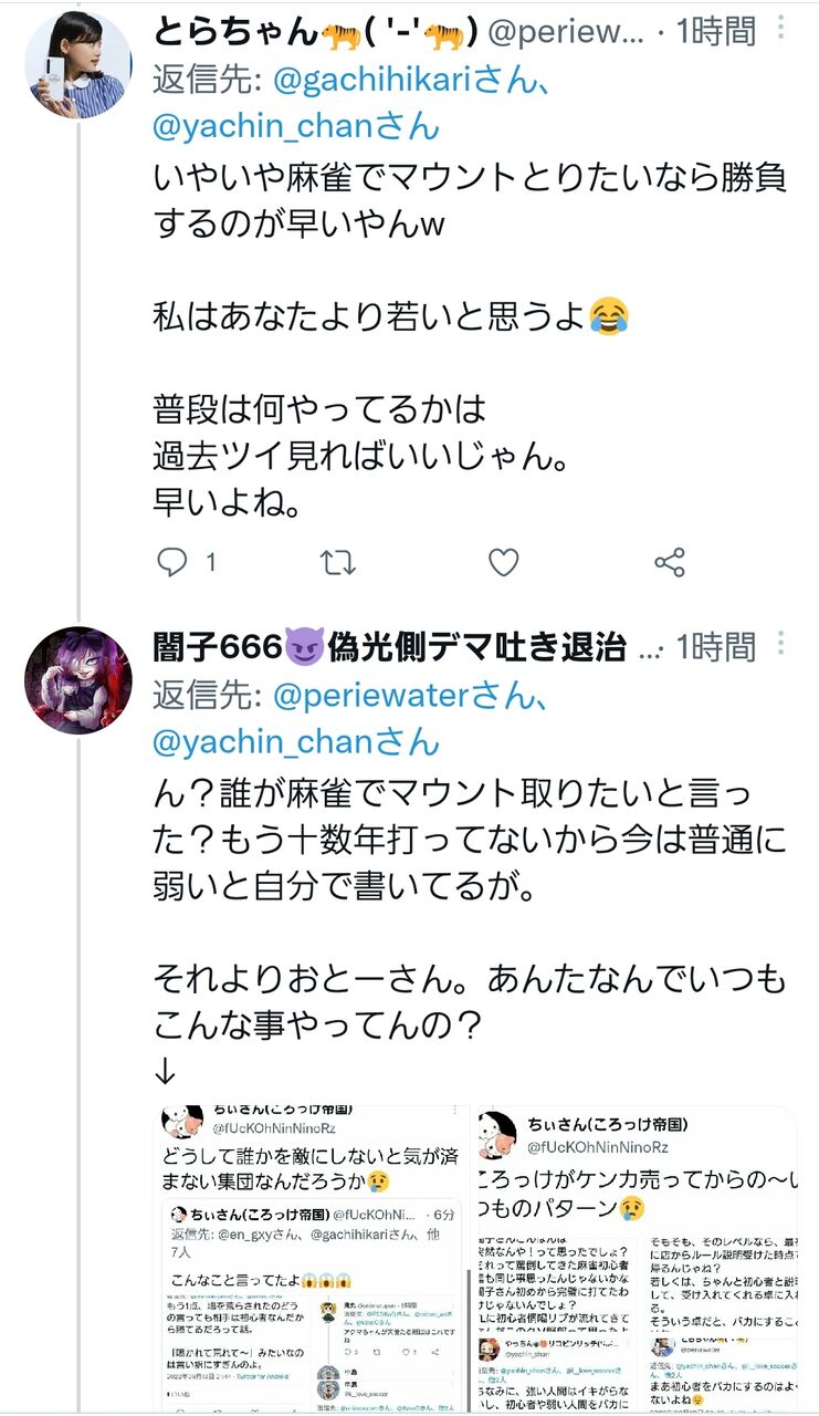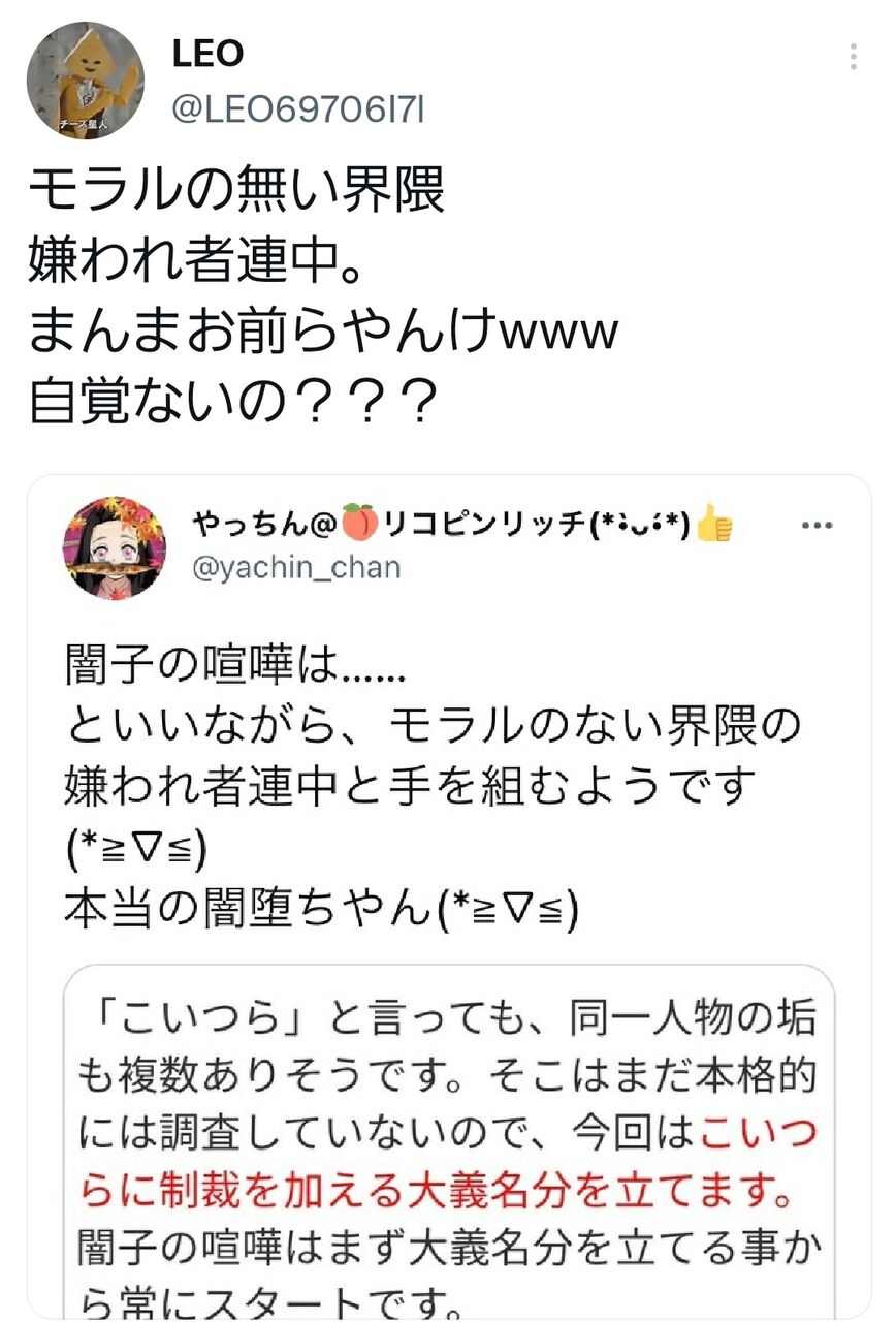しかし中身おやじの彼らは彼らで逆の主張をしています。LEOさんやちぃさんの方が「モラルのない界隈の嫌われ者連中」で、闇子はそっちと組むつもりなのかと言ってます。