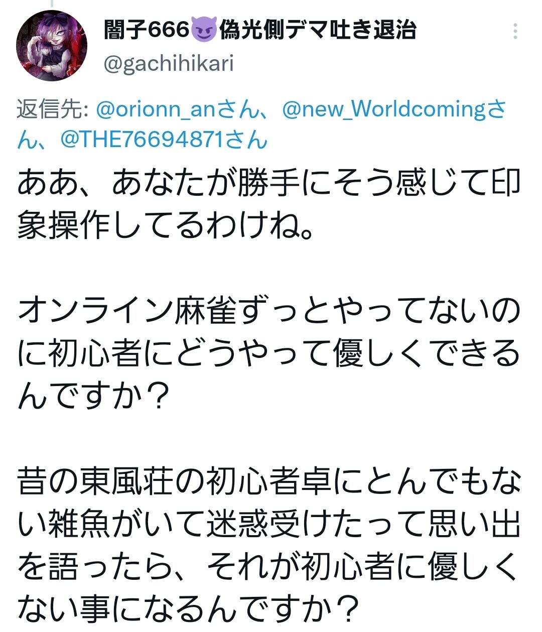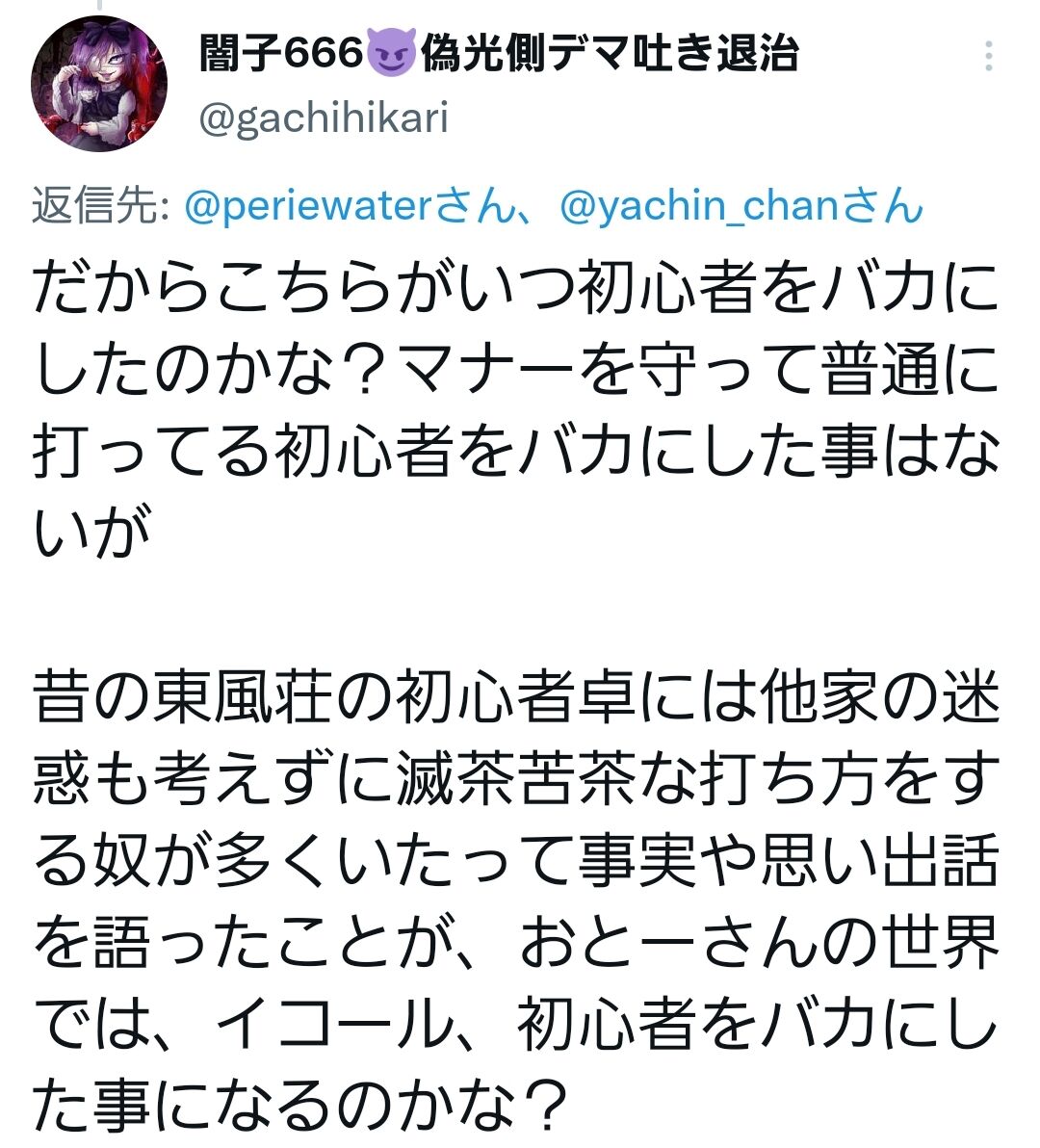 そして話の続きですが、これはいったい何で言い争っているのかというと、闇子はアクマがオンライン麻雀を打っている画像を見て思わず20年前の東風荘を思い出しました。当時の東風荘の一般卓はリアルで一度も麻雀を打った事のない奴が多数来ていて、そんなんだから場をかき乱すだけの非常識な打ち方をするクソ雑魚がいて随分と迷惑を被ったという思い出を話しました。