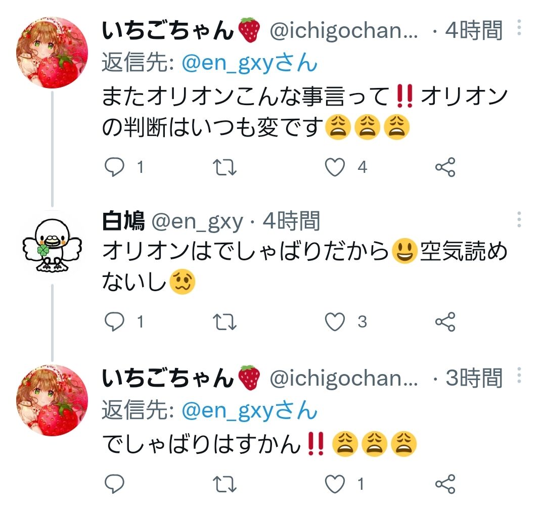 オリオンさんという人とはFFになっていますが、この人もやっちんと同じ事を言っています。むしろLEOさんやちぃさんの方が誹謗中傷集団なのだと言っています。