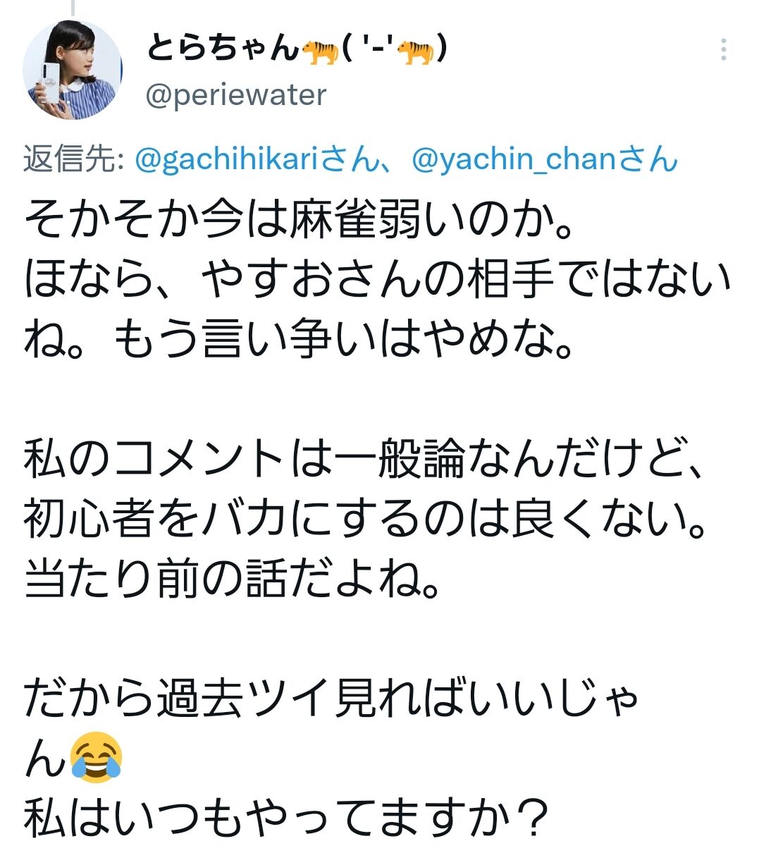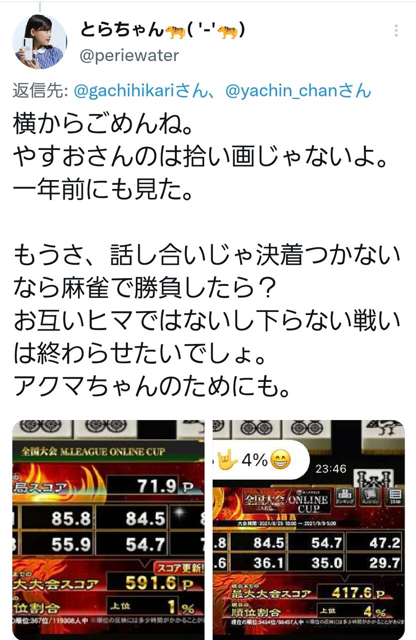いや、だからアクマはもう全然関係ないってw つうか麻雀で勝負?あんた何わけのわかんないこと言ってんの?囲碁や将棋なら3回くらい打てば実力差がハッキリと判明するけど、運の要素が大きく絡む麻雀は何日かに分けて最低でも30回くらい半荘打ってみないとわかんないよ?
