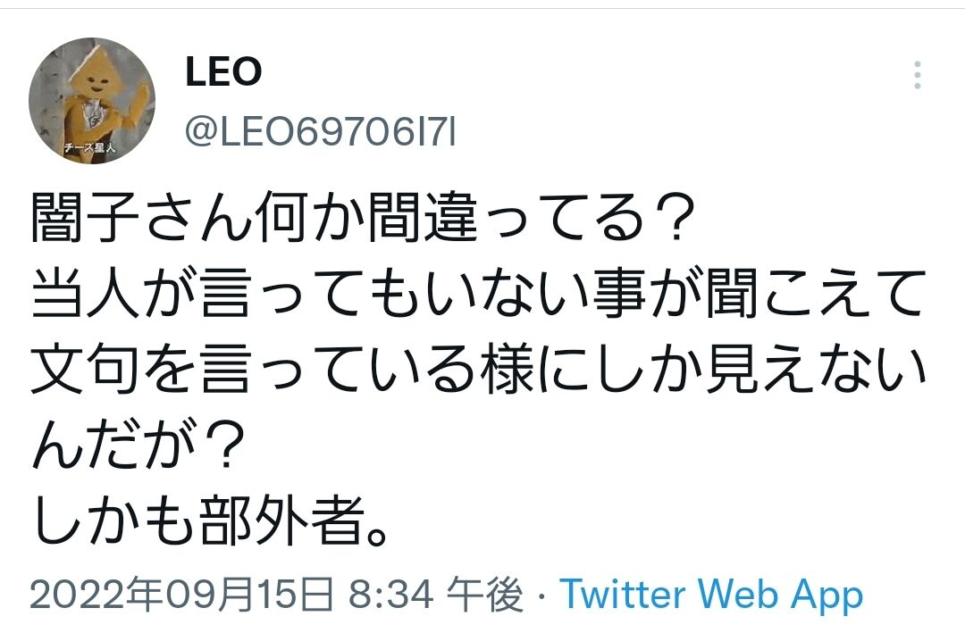 「ただ何か言いたいだけ」のこの人とも会話がまったく噛み合わないのでもういいです。そして現時点においての結論としては、この人らの過去の揉め事に関しては知りもしないし興味もないけど、この一件に関してはコロッケのグループよりLEOさんやちぃさんの言う事のほうが闇子には腑に落ちるという事です。