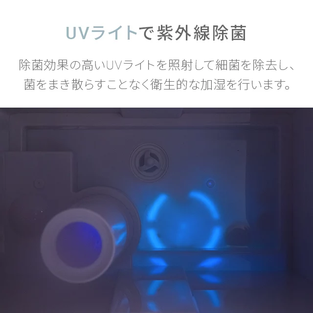UVライト除菌機能搭載。除菌効果の高いUVライトを照射することにより水槽内の菌(大腸菌、黄色ブドウ球菌等)を殺菌し衛生的な加湿を行います。※除菌率は最大94.8%