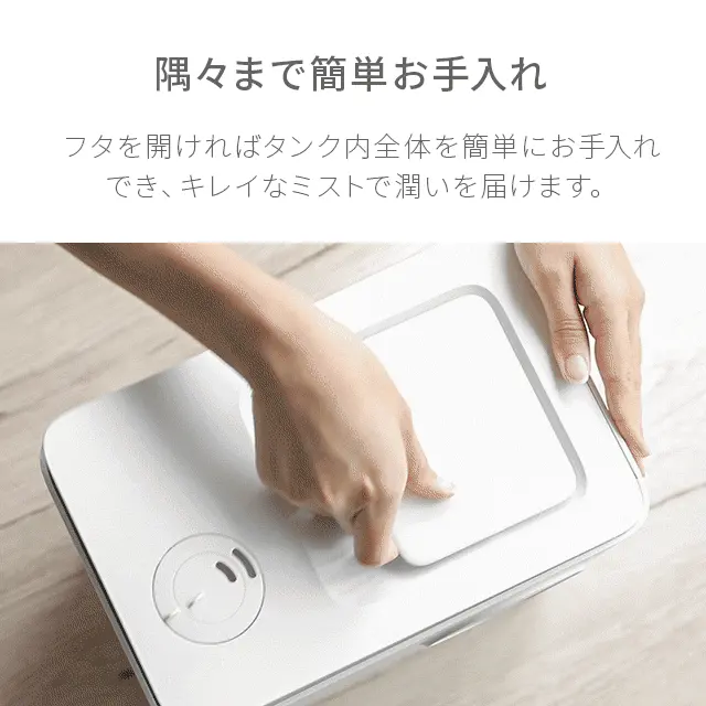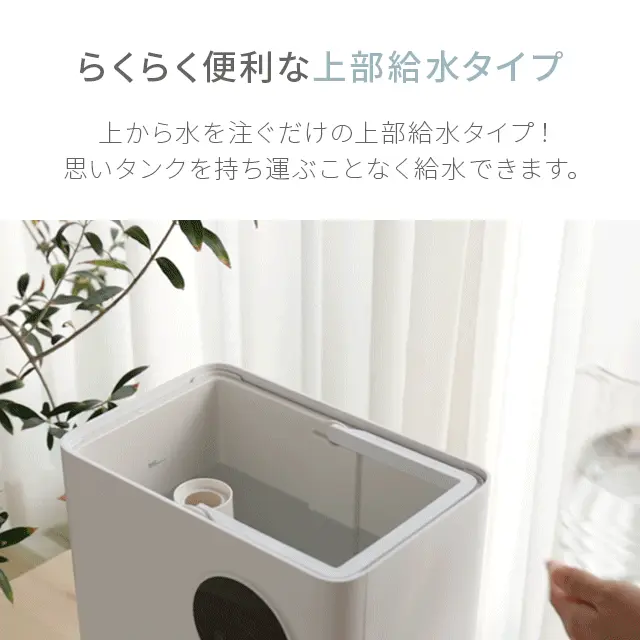 本体上部に給水口があり水を流し込むだけなので給水が簡単。タンクは約4.5L入る大容量サイズの為、給水回数が少なく済み就寝時も安心してご使用いただけます。