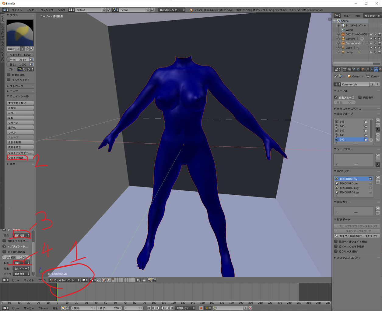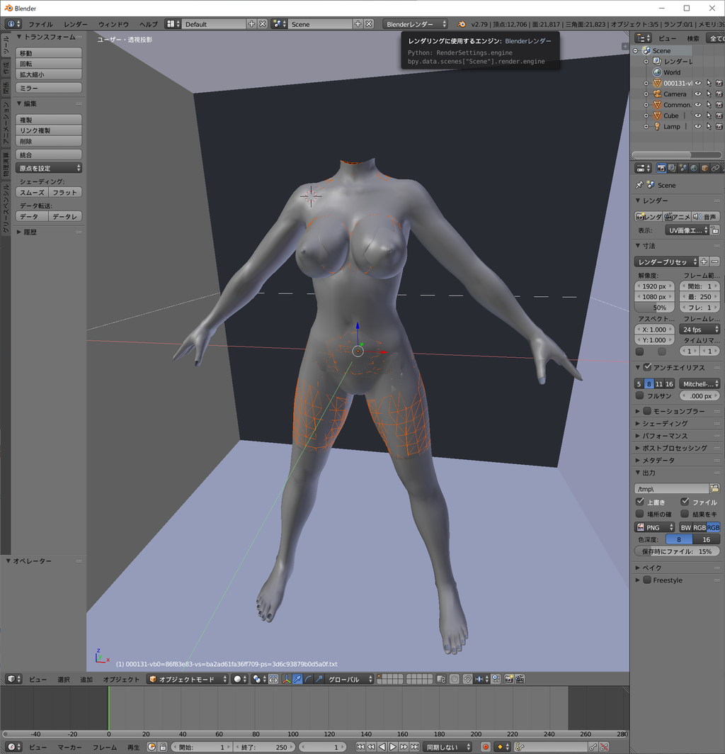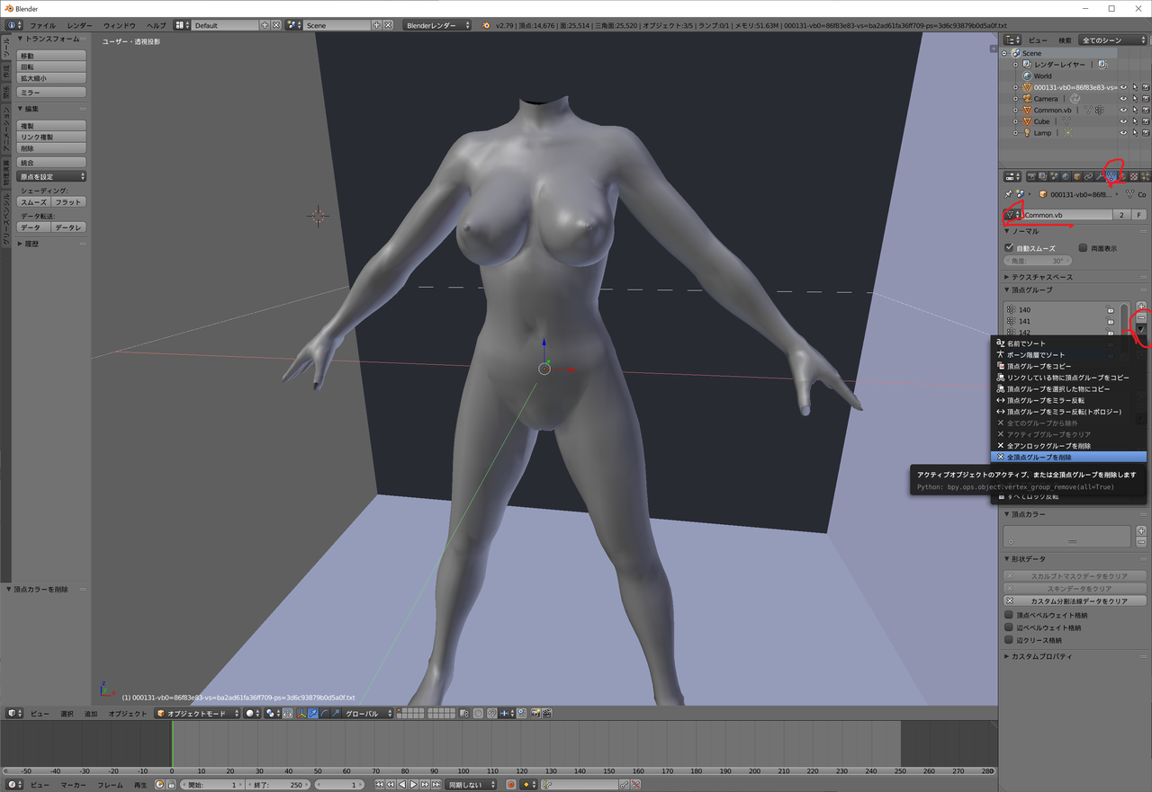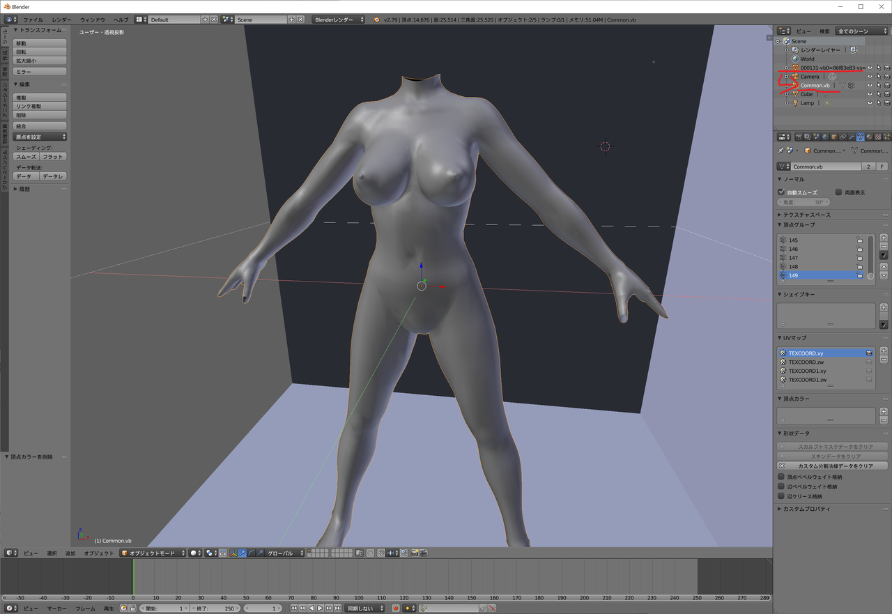 さてさて、これで終わり~っと思いきや、大抵足が四本とかになるので、要らない部分を削除、また、服を貫通している部分の肌も削除しないといけないです。問題はやったのはいいけど、忘れてしまった・・