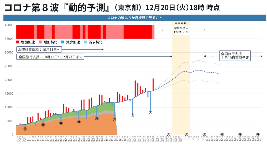 動的予測とは日々の人流やSNS(交流サイト)に投稿される市民の心理、季節によって変わるウイルスの感染力や変異状況など多くの要素をビッグデータとして分析して予測する。最新のデータを使い日々、更新するのが特徴だ。