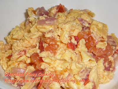 egg with tomatoes and onions. It is a quick Pinoy breakfast fare served with garlic fried rice or pandesal. It is popular and easy to prepare.
