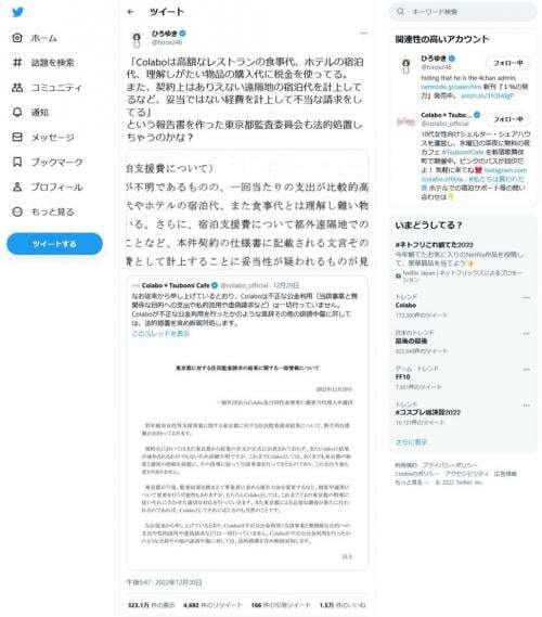 12月29日、社会活動家の仁藤夢乃さんが代表をつとめる一般社団法人Colaboより訴訟を提起されている“暇空茜”(ひまそらあかね)を名乗る人物が、「Colaboの不正会計疑惑について行った住民監査請求が通った旨のツイートを行った。2ちゃんねる創設者・ひろゆきさんは暇空さんのツイートを引用、