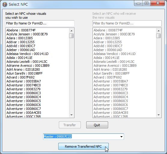 今までに蓄積されたコピー設定を削除したい時には下方の「Select A Transferred NPC With...」をクリック、名前を選択してその下のボタン「Remove Transferred NPC」を押す。