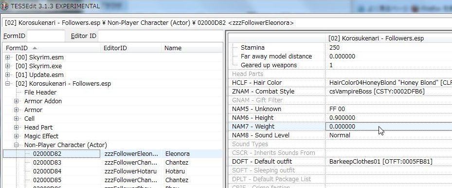 weightをTES5Editで調査する。コピー元MODを読み込み、