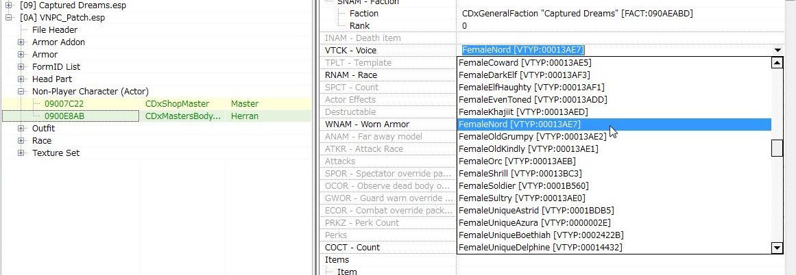 男キャラを女に変更しても声が男のままなのでTES5Editで変更する。
