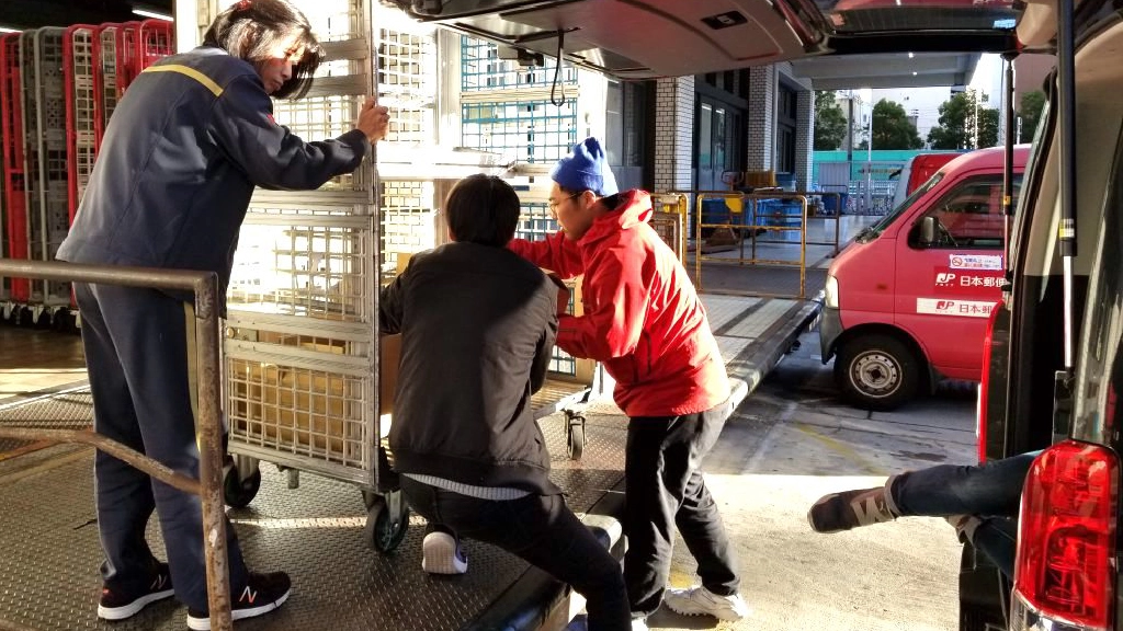 めちゃくちゃ緊張した、郵便局受付の瞬間(車から出ている脚が僕です。)