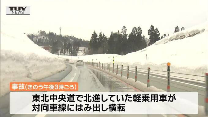 この事故は、きのう午後3時ごろ、大石田町今宿(いましゅく)の東北中央道で、北に進んでいた軽乗用車が対向車線にはみ出し、横転したものです。