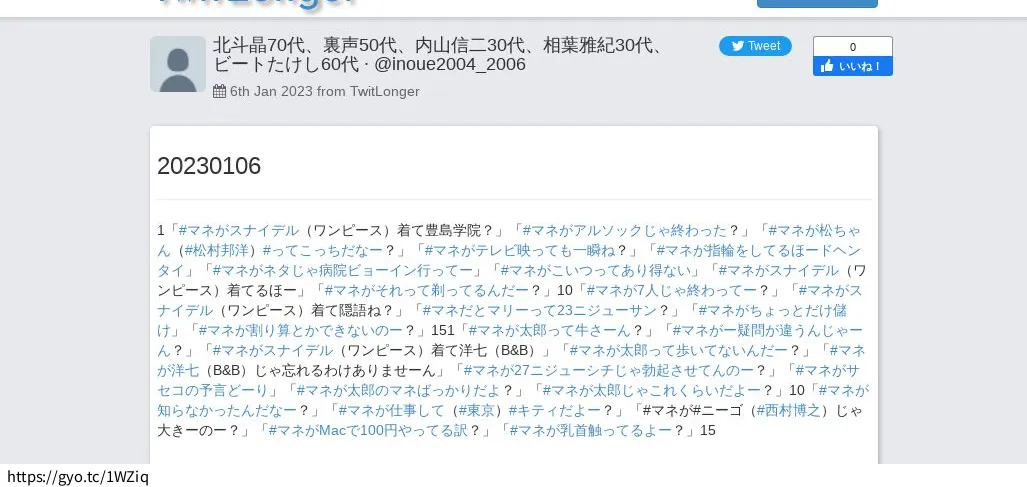 20230113「#マネがここじゃ大塚(ピンクサロン)じゃー?」「#マネがいつもどーりじゃ6(TBS)ロクっ」「#マネが豚あ」「#マネが子供たちはどーしたのっ?」「#ロッテン(グロサイト)で嫌われろー?」「#マネが彼女じゃネタをやったよねー?」「#マネが彼女が一生できねーか?」「#マネがなんたらで