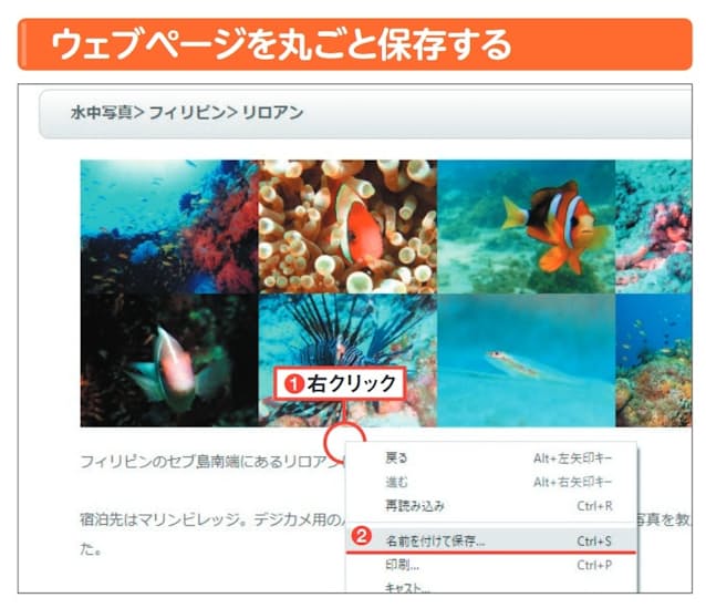 ウェブブラウザーで「名前を付けて保存」を選ぶと、開いているページの素材データ(HTMLや画像など)を丸ごと保存できる(図1~図3)。これにより、オフラインでの閲覧が可能になる。HTMLと画像などが入ったフォルダーは必ずセットで管理しよう。
