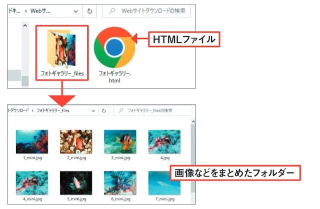 画像を個別に取り出す必要がなければ「MHTML」という形式で保存する手もある。Chromeなら図2で「ウェブページ、1つのファイル」、Edgeなら「Webページ、単一ファイル」を選んで保存すると、HTMLや画像などがまとまった単一ファイル(拡張子はmhtml)が保存される。