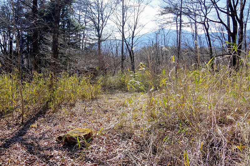 白州道の駅、スーパーから車で6分程。県道614号から脇道にそれ、田園風景を抜けた先、山の麓の静かな場所に3軒の家が建ち、その西側の約700坪の広い土地が物件だ。敷地内は平坦で、まばらに樹木が育っている。冬には樹木越しに南アルプスの山並みが望める。現オーナーは敷地の南側に小屋を建て、週末にキャンプを楽しんでいたとのこと。小屋には水回りは無く、外に水道があるのみ。今後、雑木の雰囲気を残して家を建てても良いし、全体を伐採し広々と楽しむのも良いだろう。