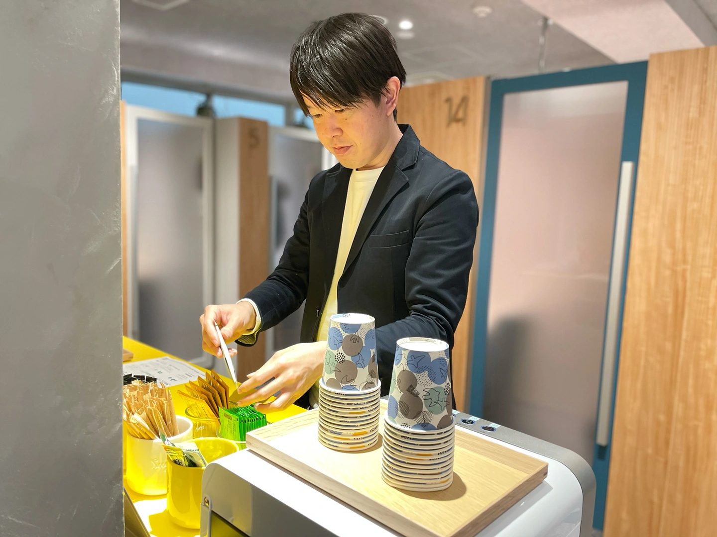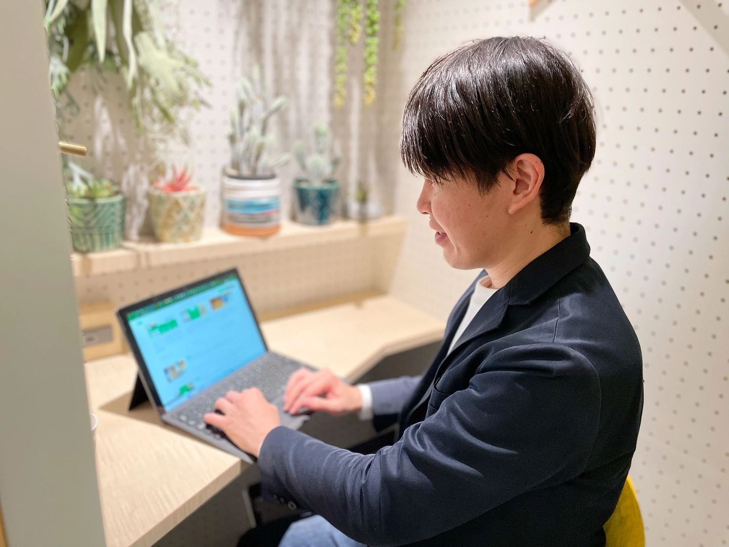 セルフチェックイン(無人)店舗ではありますが、居心地の良さを感じていただける環境にしていきたいです。無人運営のためお客様と直接コミュニケーションをとる機会が少ないですが、集中しやすい環境づくりや、長時間作業でも気分転換でき居心地の良いスペースになるよう工夫しています。