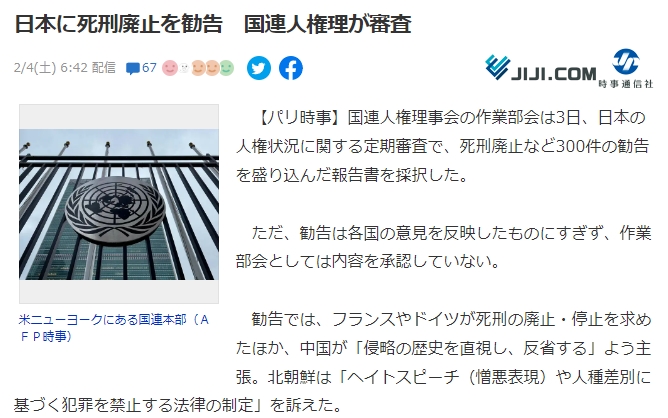 勧告では、フランスやドイツが○刑の廃止・停止を求めたほか、中国が「侵略の歴史を直視し、反省する」よう主張。北朝鮮は「ヘイトスピーチ(憎悪表現)や人種差別に基づく犯罪を禁止する法律の制定」を訴えた。