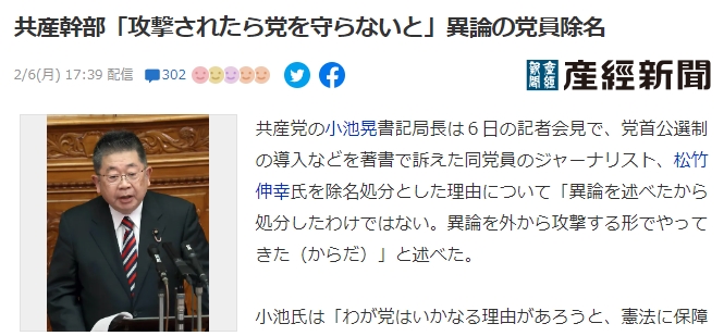 共産幹部「攻撃されたら党を守らないと」異論の党員除名(産経新聞)