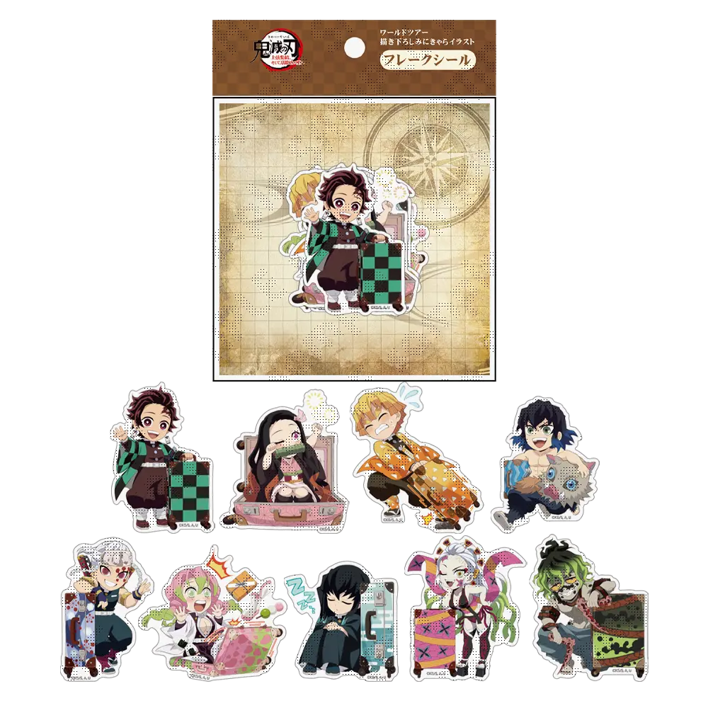 ワールドツアーをする「鬼滅の刃」のキャラクター達の描き下ろしみにきゃらイラストを使用したフレークシールセットです。