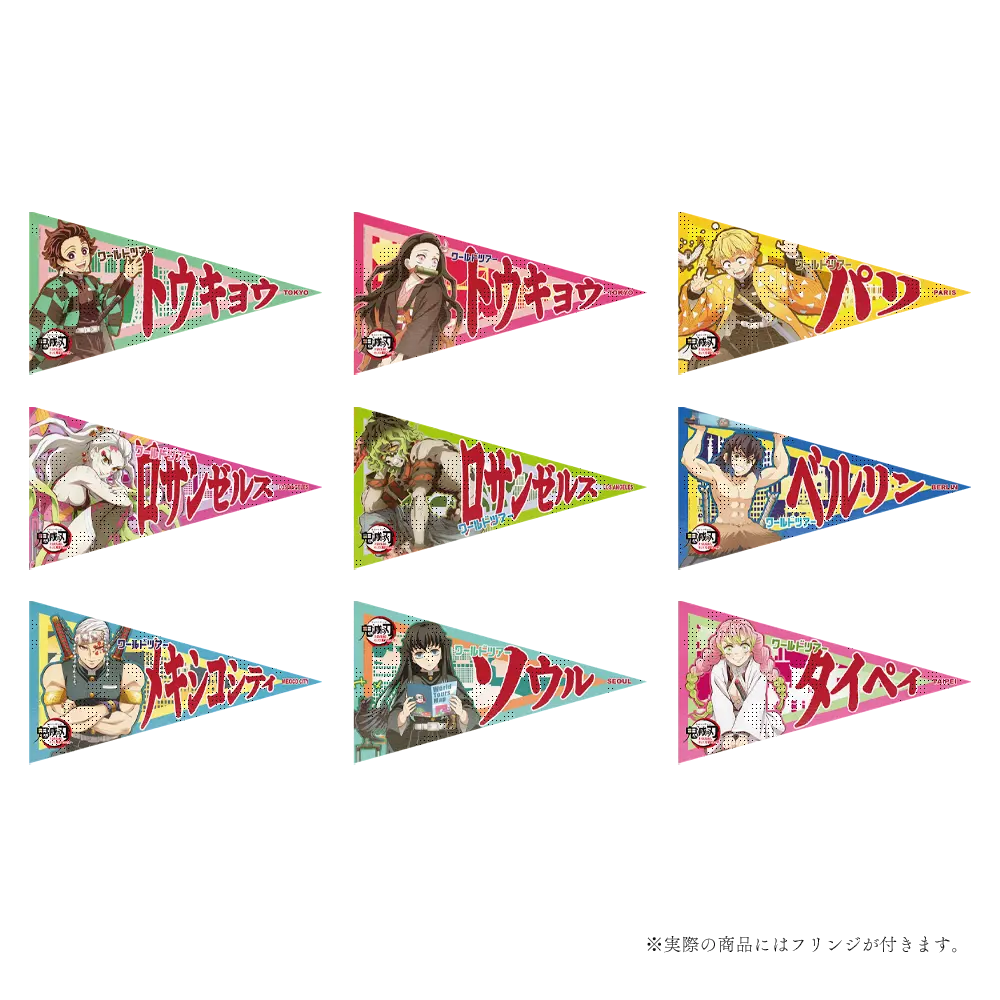 ワールドツアーをする「鬼滅の刃」のキャラクター達の描き下ろしイラストでデザインされたペナントです。