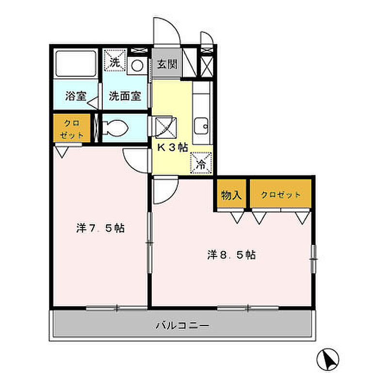 | 間取り | 2K (洋室 8.5帖(1階) / 洋室 7.5帖(1階) / キッチン 3帖(1階)) | 専有面積 | 43.71m2 (13.22 坪) | ||
