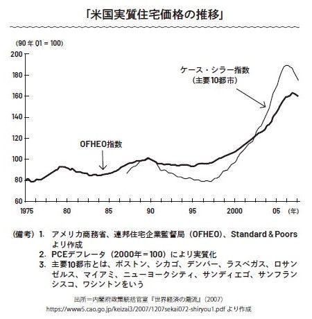 次の図は、ケース・シラー住宅価格指数という、アメリカの住宅価格を表す代表的な指数です。図からは、主要都市の値段はサブプライム時にその前より2倍ほど上昇していることがわかります。