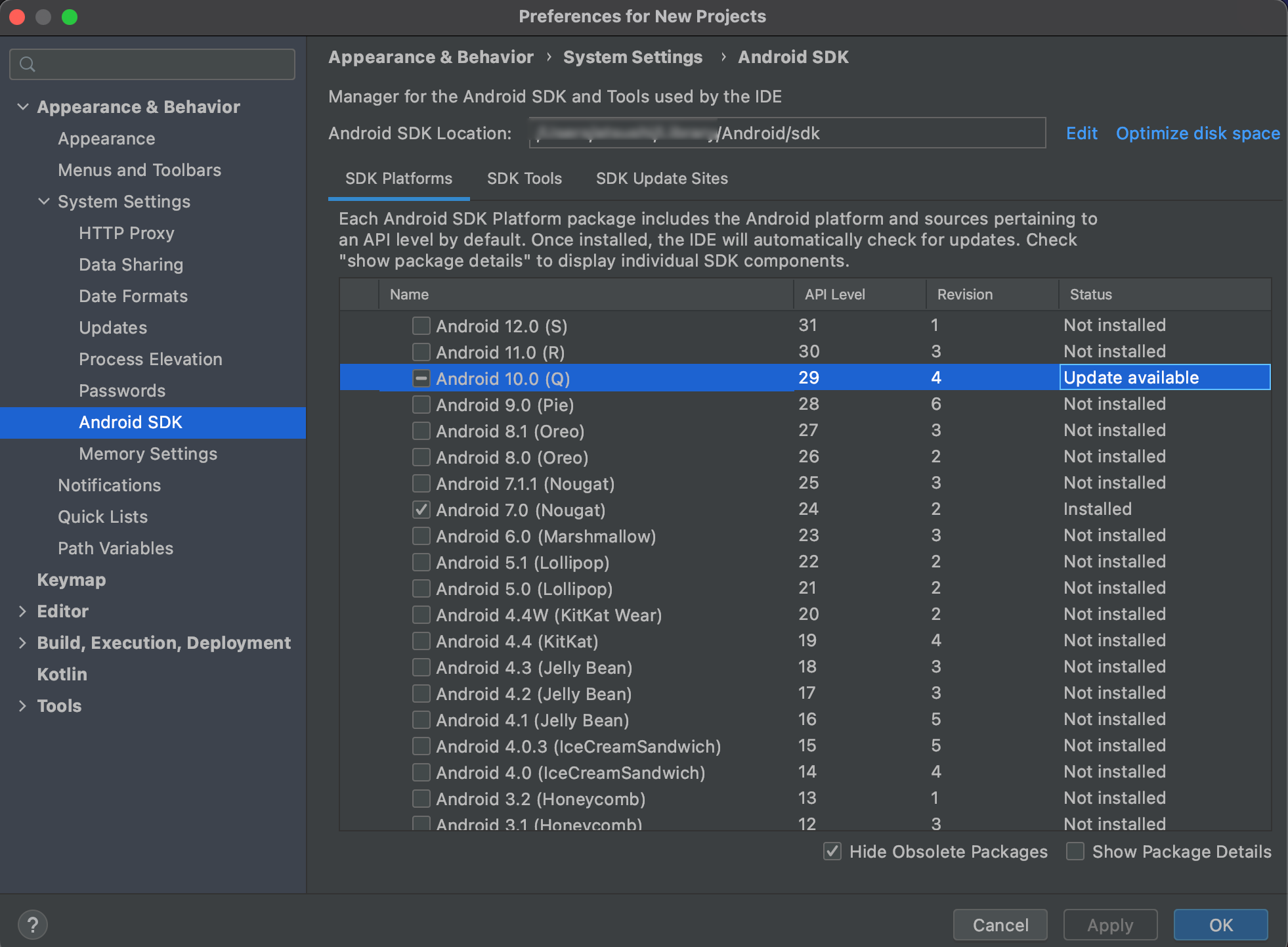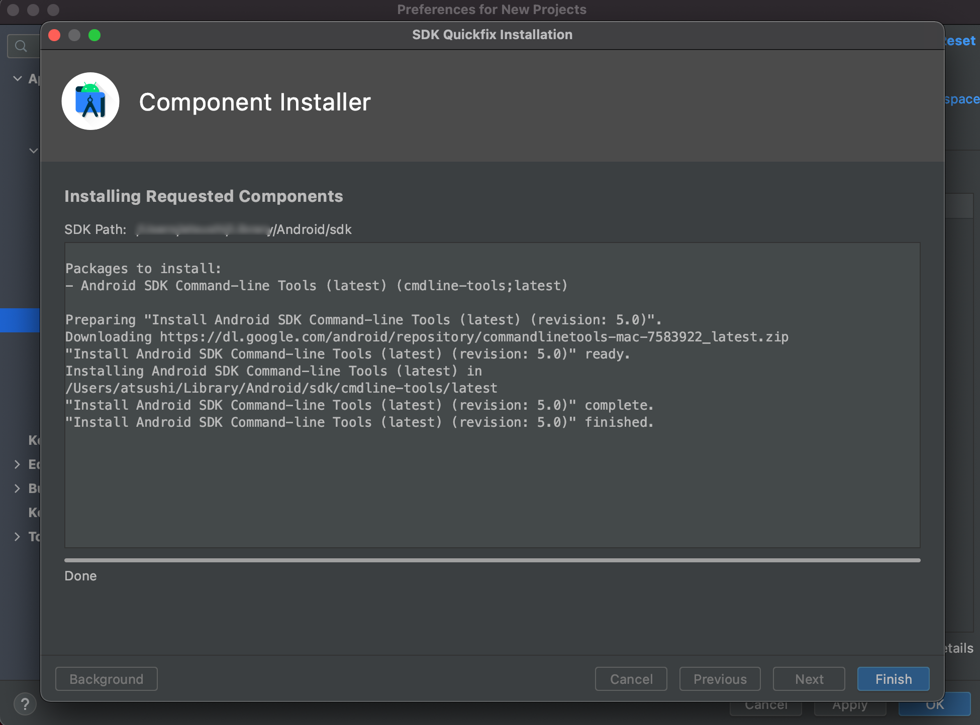 ↑この画面に、sdkのパスがあります。ちょうどモザイクしているところですね。(後で使います。)